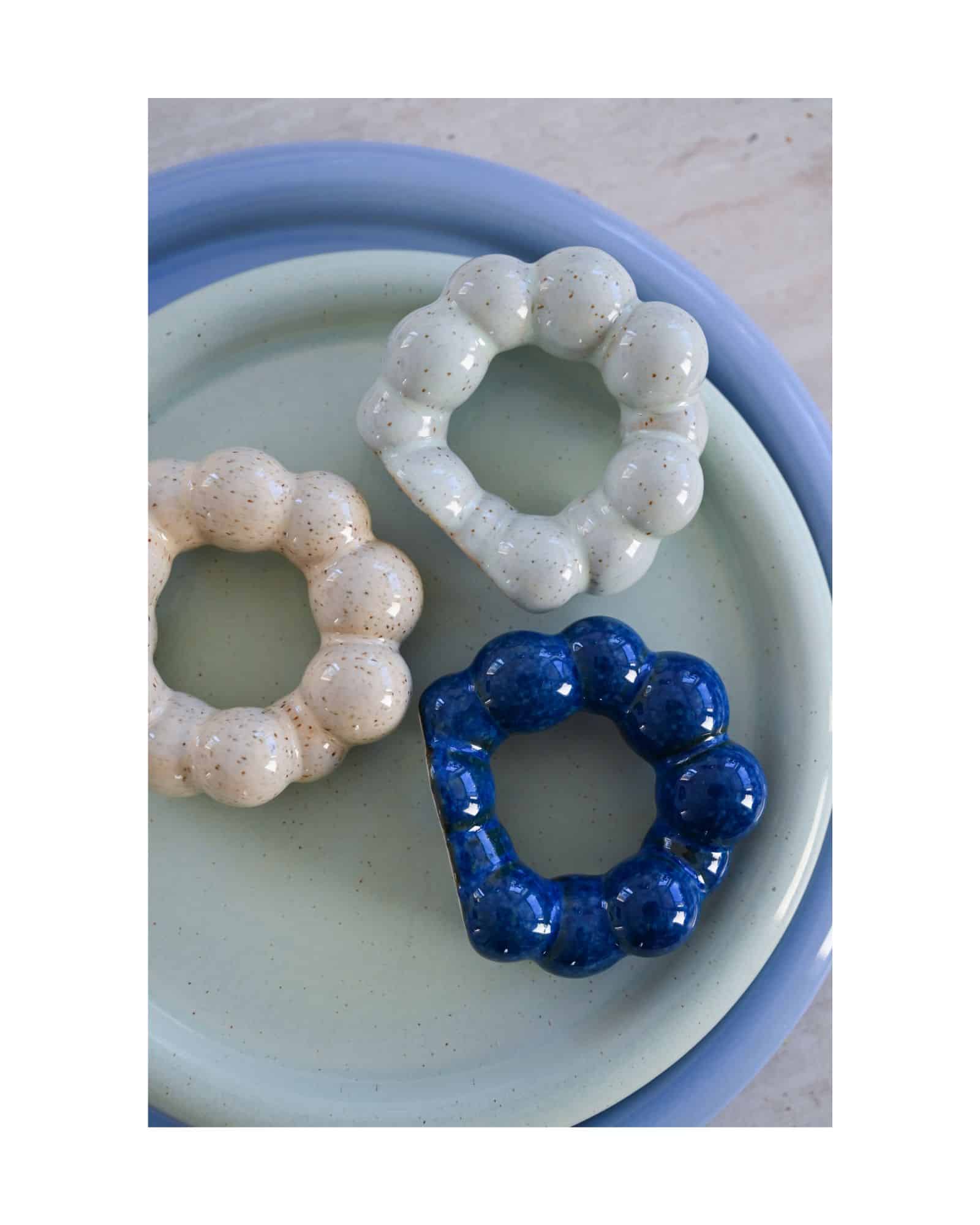 Tillverkade i stengods med en reaktiv glasering som ger subtila variationer i färg och struktur. Varje servettring är handgjord, vilket gör varje exemplar unikt och ger en levande känsla till din dukning.