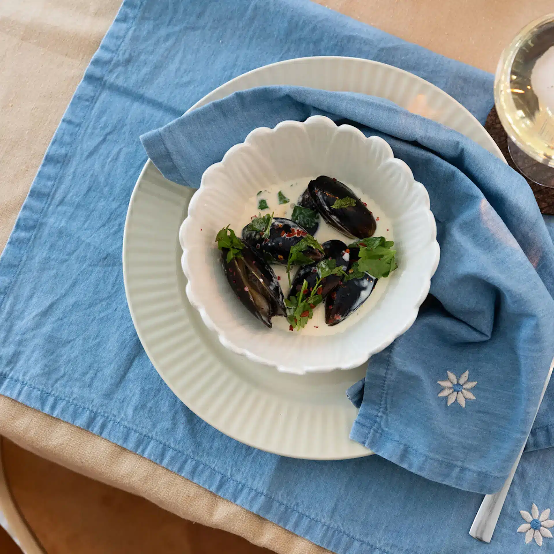 Sköna tygservetter i en mjuk certifierad bomullsdenim prydda med en broderad beige blomma som matchar Eden-serien. Den svala denimfärgen skapar både karaktär och en klassisk känsla i dukningen. Mått: 45×45 cm. Levereras i två-pack. Eden-kollektionen kombinerar handmålade blommor i ett tidlöst mönster med mjuka pastelltoner. Välj mellan en harmonisk mix av gult, beige och grönt eller en svalare kombination av blått, grönt och beige. Serien innehåller kökshandduk, hamamhandduk och vaxade dukar. Nytt för säsongen är Eden Denim – servett och handduk i mjuk, certifierad bomullsdenim, elegant dekorerade med ett broderat beige blommotiv som sömlöst kompletterar Eden-serien. En kollektion som bjuder in till en känsla av sommarens milda bris året om.