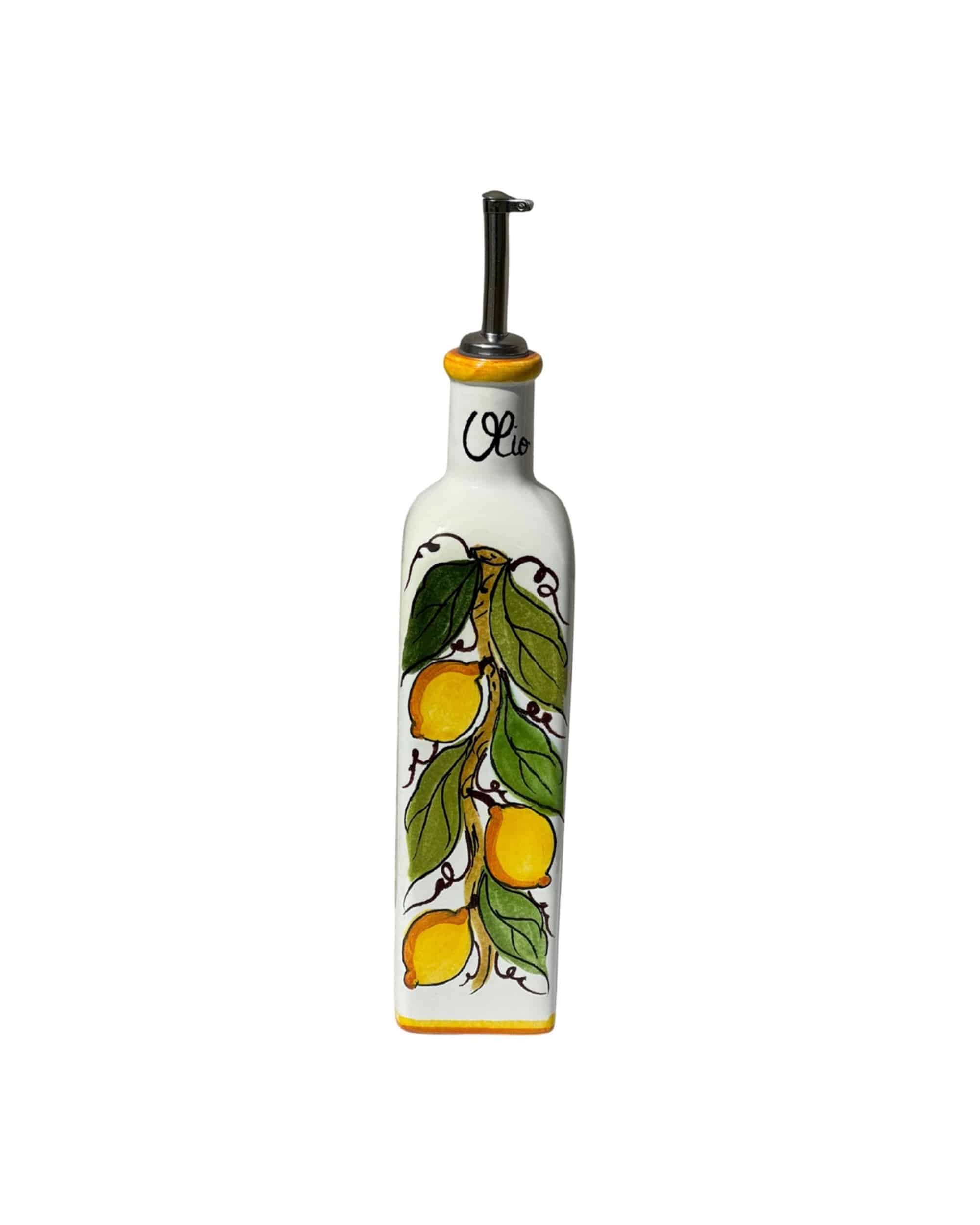 Olivoljeflaska keramik Limone. Förgyll din matlagning med Olivoljeflaska Limone. Denna vackra flaska i keramik sprider en känsla av medelhavet i ditt hem. Italienska hantverkare tillverkar flaskan för hand. De målar det charmiga citronmotivet med stor omsorg. Det gör varje flaska unik.