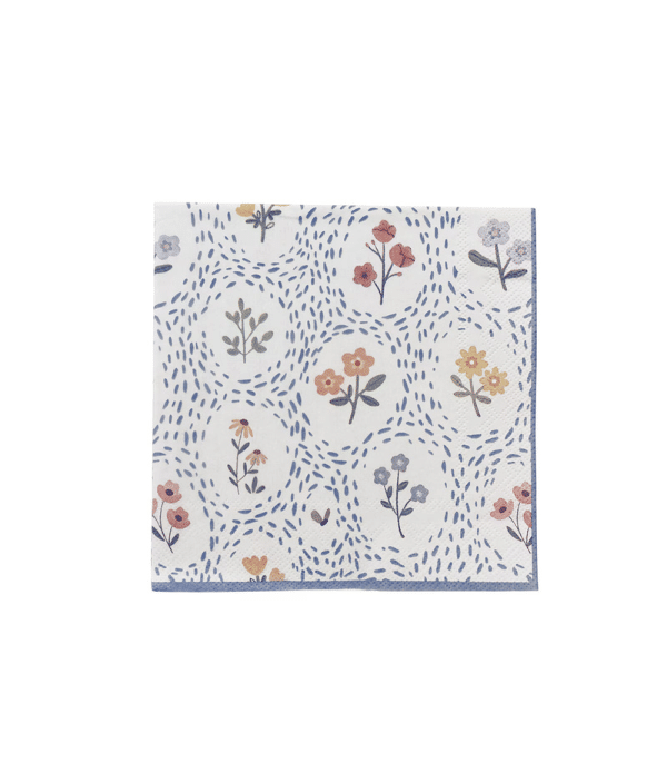 Skapa en elegant och färgstark dukning med pappersservett Fleur. Servetterna pryds av ett vackert blomstermotiv i blå nyanser som ger bordet en livfull och inbjudande stil. Motivet påminner om somriga trädgårdar och fungerar både för vardagsbruk och festliga tillfällen. Du kan därför använda servetterna vid middagar, bufféer, kalas eller högtider och ge dukningen en stilfull och personlig känsla.