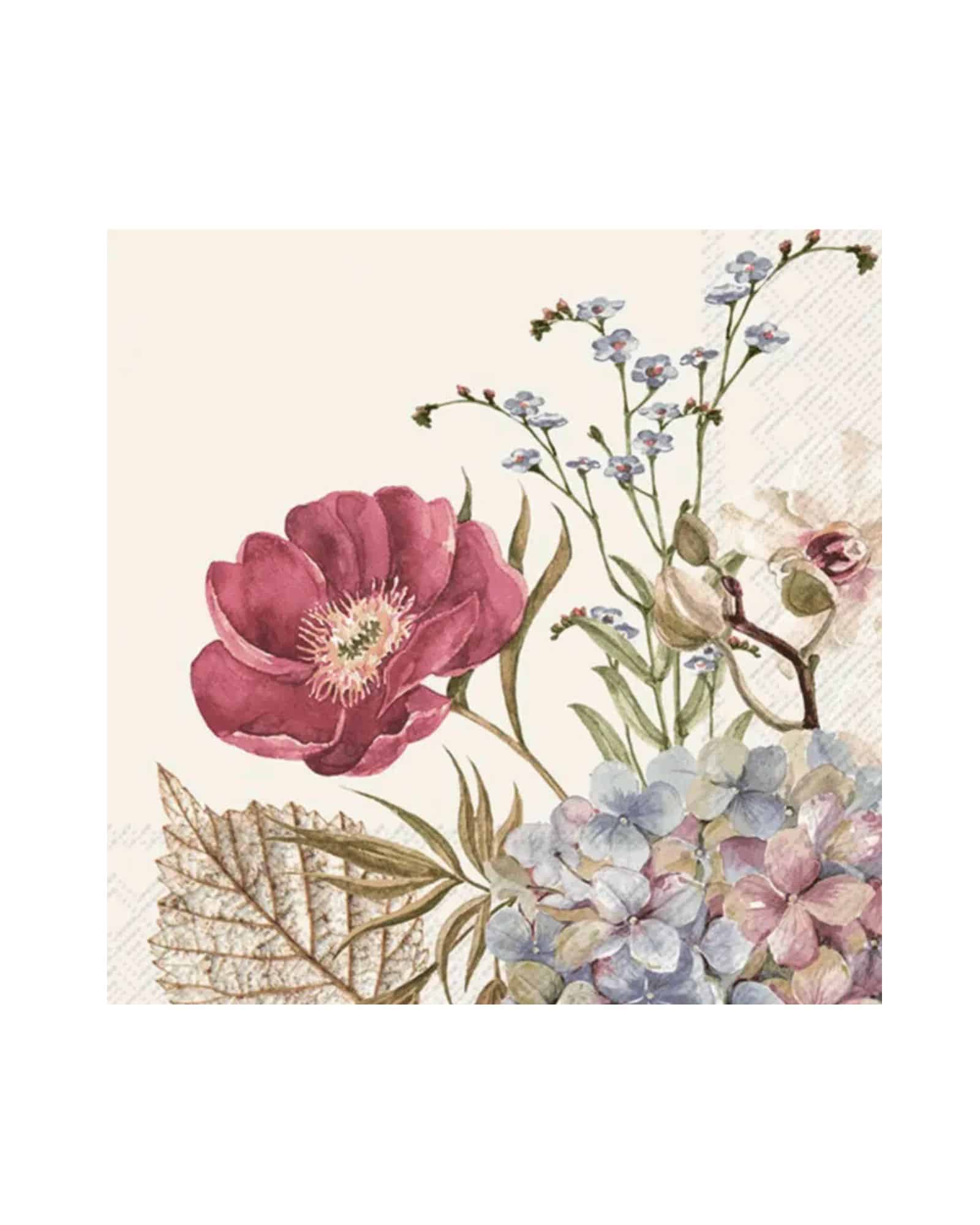Först och främst utmärker sig servetten genom sitt eleganta och detaljrika blommotiv. På en mjuk krämfärgad bakgrund breder vackra, handmålade blommor ut sig i harmoniska färgtoner – allt från pudrigt rosa till dämpat grönt och varmt bärnstensgult.