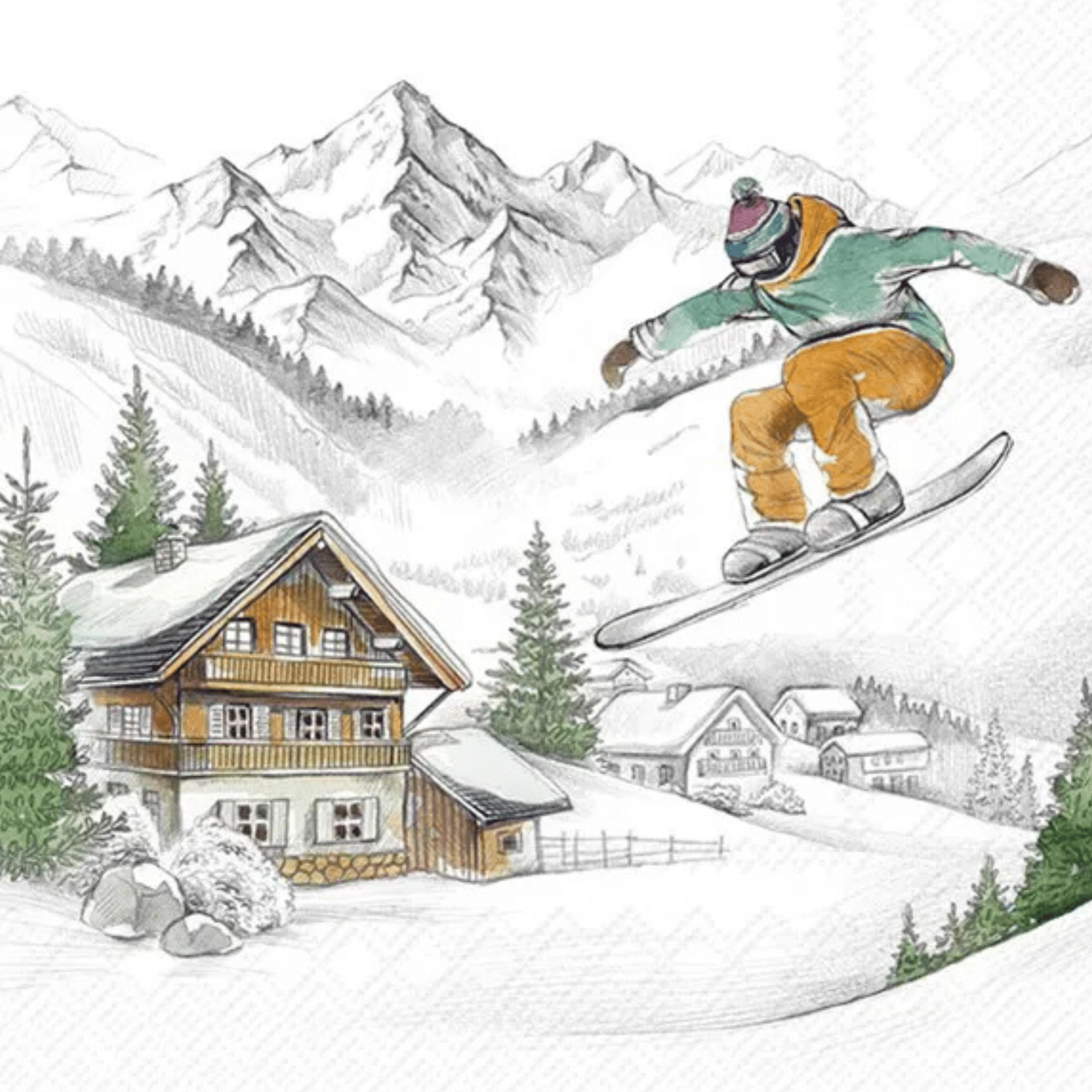 Till att börja med visar servettens motiv en vacker skidsemester med snötäckta fjäll, skidåkare i full fart och charmiga vinterdetaljer som sätter stämningen direkt. Färgerna harmonierar med vinterlandskapets kalla och friska toner, samtidigt som varma inslag bidrar till en hemtrevlig känsla. Därför fungerar servetten perfekt för både barn och vuxna som älskar vinterns äventyr.