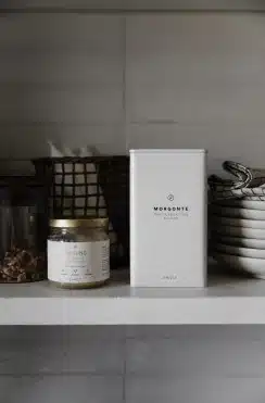 Grönt örtte med äpple och kanel i en vit plåtburk.
