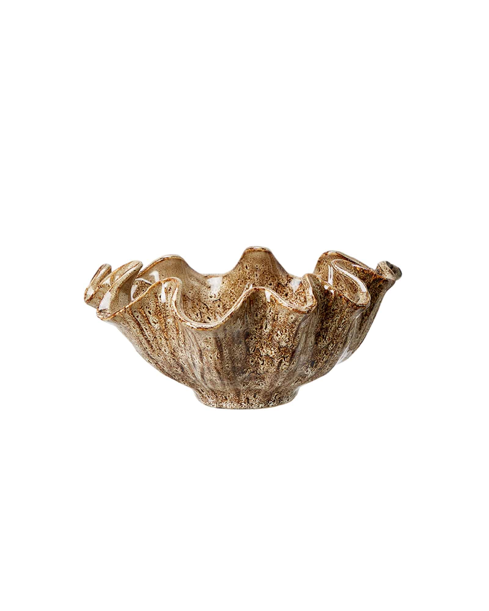 Hanna skål brunmelerad liten. Hanna skål brunmelerad – liten är en dekorativ och funktionell skål i stoneware med en mjukt vågig, snäckliknande form. Den brunmelerade glaseringen ger skålen ett levande och naturnära uttryck med vackra skiftningar i bruna toner, vilket gör varje exemplar unikt. Med sina mått på 28 x 12 cm och en diameter på ca 18 cm är skålen perfekt för mindre serveringar eller som dekorativ detalj i hemmet.