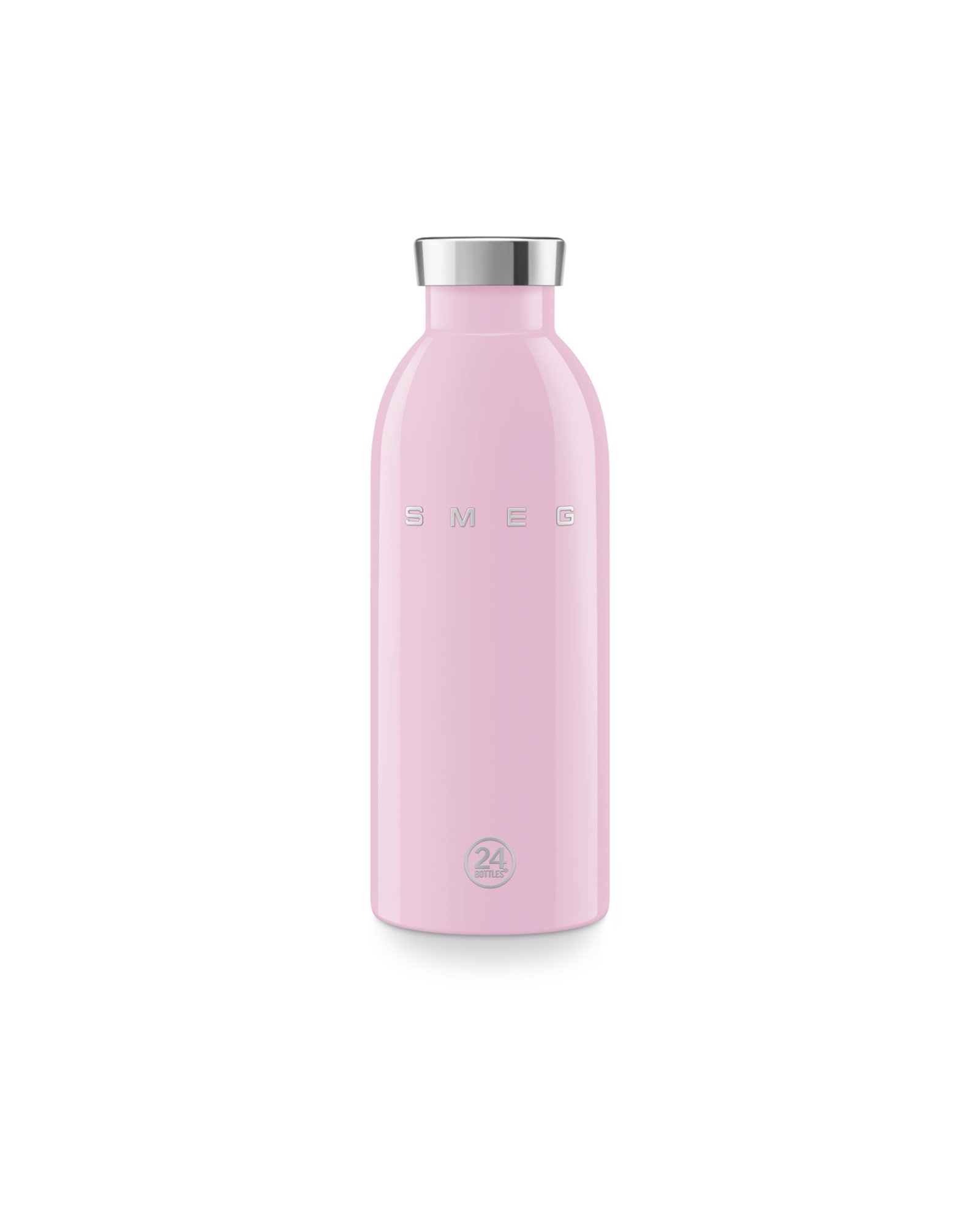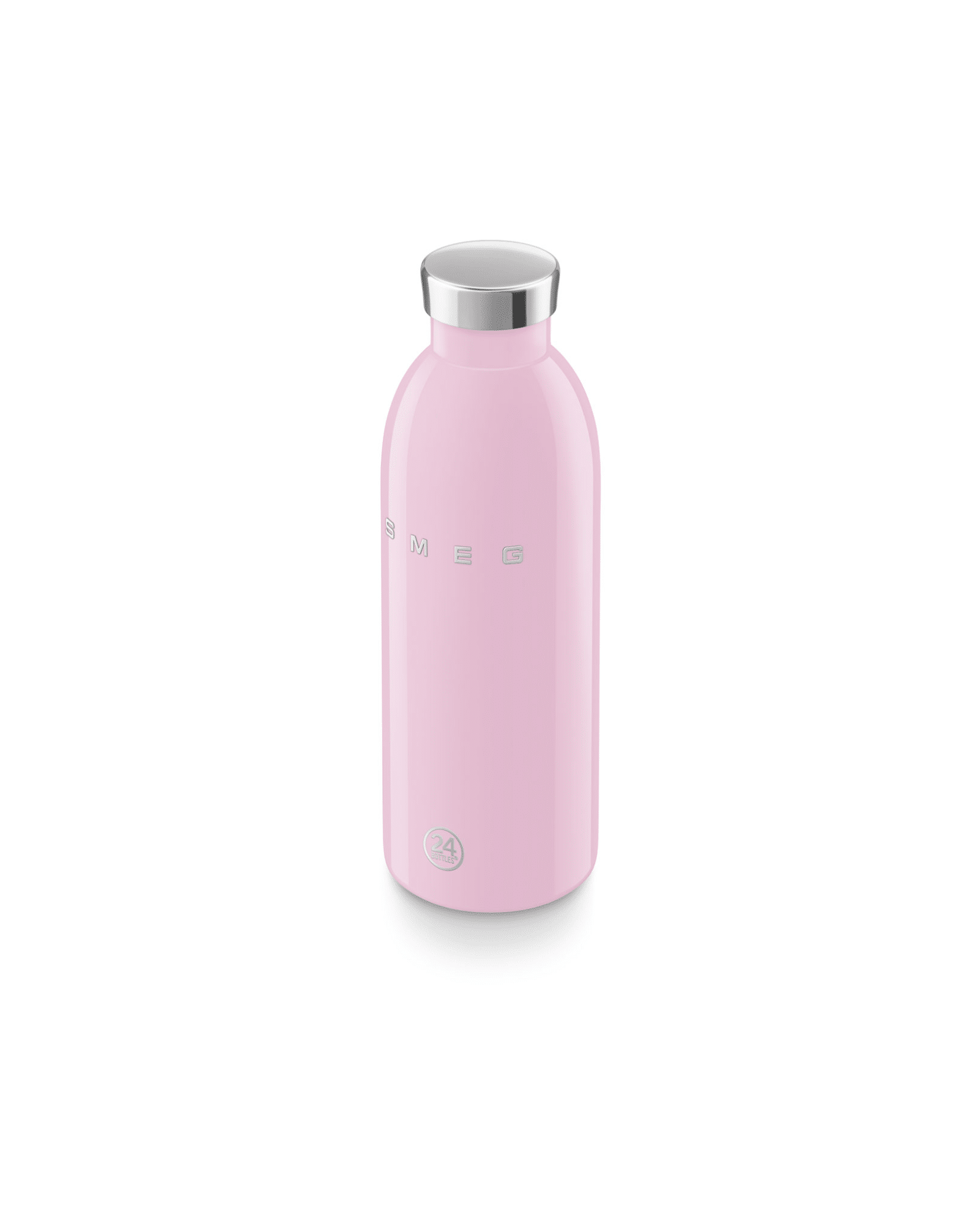 Clima Termosflaska 500 ml kombinerar ikonisk Smeg-design med praktisk funktion från 24Bottles. Den högblanka rosa finishen och präglade logotypen ger en tidlös 50-talsstil, samtidigt som dubbelväggskonstruktionen håller drycken kall i upp till 24 timmar och varm i upp till 12 timmar.