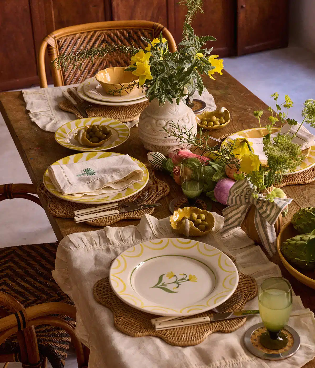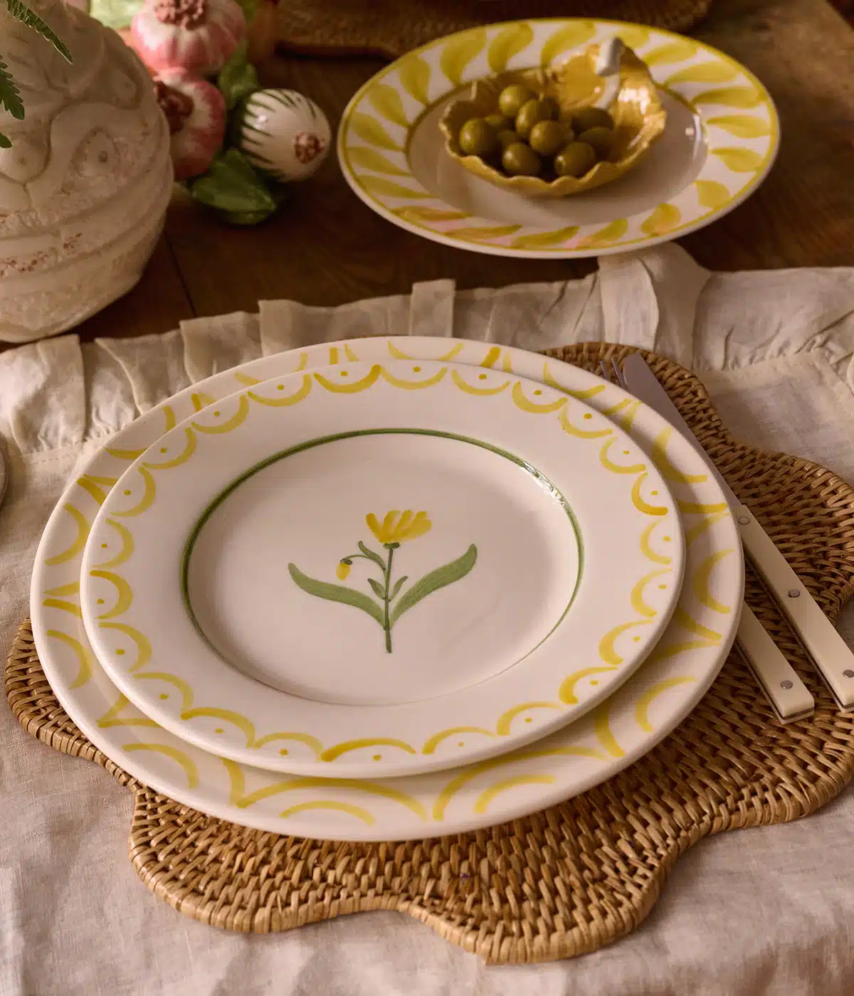Motivet har en rustik cottagecore-känsla med blommiga detaljer. Det passar perfekt till somriga dukningar och trädgårdsfester.