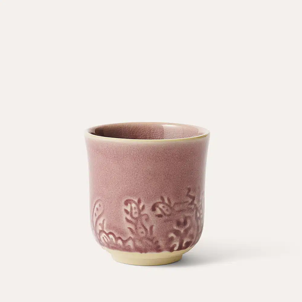 Sthåls espressomugg vilar skönt i handen. En liten, vacker kopp för dig som gärna njuter en espresso med både gom och öga. Espressomuggen för finsmakaren helt enkelt. Den har lagom storlek för dig som vågar servera mer än bara kaffe i kopp. En liten soppa till förrätt eller kanske glögg i juletider. Vacker keramik ska också vara praktisk. Av mönstret framgår att espressomuggen är en del av Sthåls serie Arabesque. Den matchar andra delar i samma serie. Sthåls espressomugg i Lavender är helt glaserad på insidan. Utsidan däremot visar hur vackert det blir när den fina lila glasyren får möta den naturligt vackra stengodsleran. Lavender är en så kallad effektglasyr som ger liv och variation åt keramiken. Den flödande glasyren ger en livfull yta och varje exemplar blir unik.