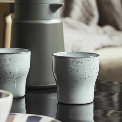 Denna uppsättning med 1 ljusgråa termosmuggar från House Doctor är ett avslappnat men ändå snyggt val när du vill njuta av din varma dryck. De höga muggarna heter Liss och är gjorda av stengods med en grå glans med mindre, avsiktliga brister för att skapa ett rustikt, avslappnat utseende. Tack vare den avsmalnande formen är muggen bekväm att hålla medan dubbelväggen håller ditt kaffe eller te varmt längre. Använd muggarna på ditt hemmakontor, för en kopp te på kvällarna eller för en eftermiddagsfika. När som helst, egentligen. Detta är ett praktiskt val med vardaglig elegans i centrum.