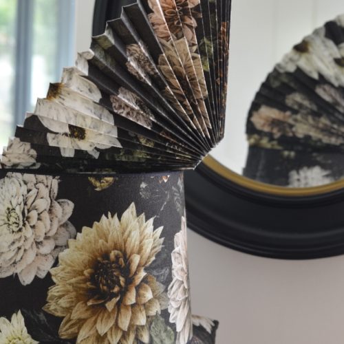 Vacker, plisserad, utställd lampskärm i svart med mönster av dahlior. Lika fin på din favorit vintagelampfot som på den nya, moderna.