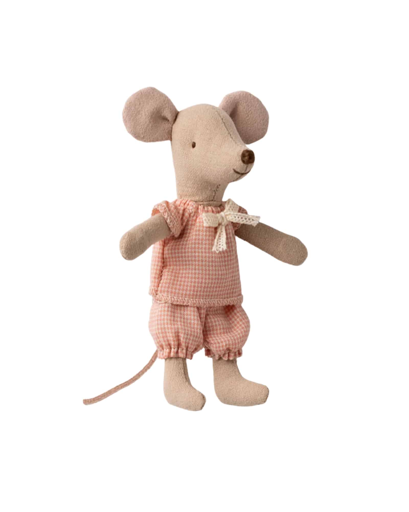 Tillverkad i bomull och kartong, är Lillasyster Mus både mjuk och tålig, perfekt för små händer. Hon passar utmärkt tillsammans med Lillebror Mus, Prinsmus Storebror, Prinsessa Mus eller andra Maileg-figurer. Tillsammans kan barn skapa små sagovärldar och låtsasberättelser.