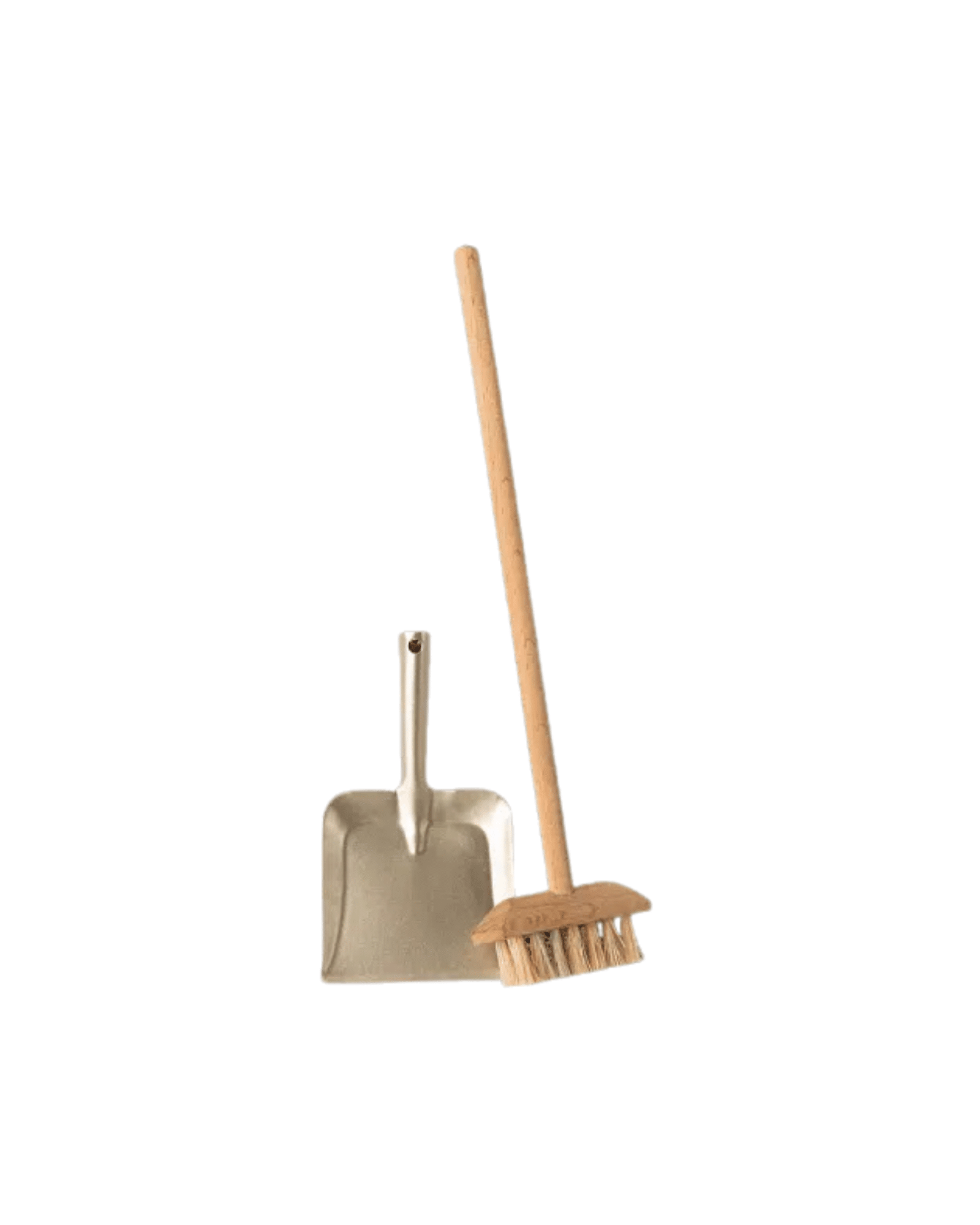 Med detta miniatyrkvastset är du redo att städa upp. Sopskivan kommer i en vacker varm silverfärg med en träkvast.