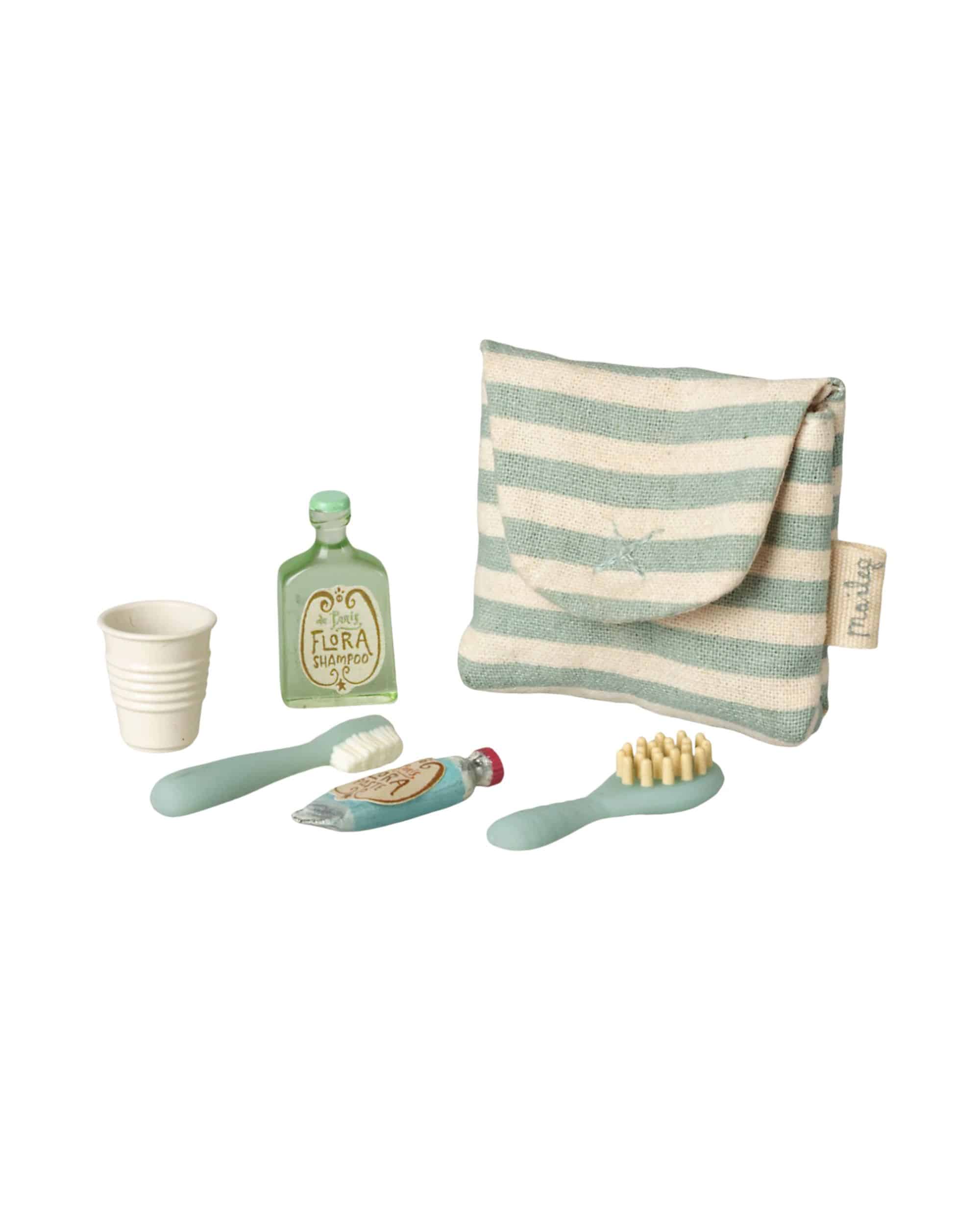 Maileg Tandborsteset i väska till Mus Blårandig. Innehåller tandborste, kopp, spegel, kräm och parfym. Perfekt för musens vardag och lekfulla rutiner.