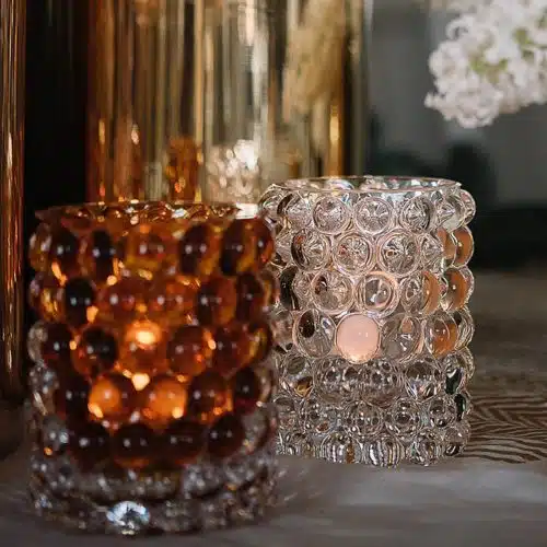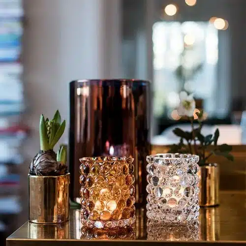 Hurricane Boule ger med sina optiska bubblor ett skimrande ljus och en lyxig tyngd. Alla ljuslyktor från Skogsberg & Smart bär spår av hantverk vilket gör varje ljuslykta helt unik. Boule är lika vacker som vas till blommor. Hurricane Boule Clear är 12 cm hög och är 10 cm i diameter. Vikt ca 1000-1300 gr. Kom ihåg att varje lljusykta är unik, så avvikelser på +/- 3% är en del hantverket och charmen i vår design. Bubblorna tillkommer när man blåser glasmassan i en gjutjärnsform och formas sedan för hand. Ytan är fylld med optiska bubblor som gör att Hurricane Boule får ett skimrande ljus i stilmässigt släktskap med 1970 talets glasdesign. Tål ej maskindisk. Vi ett rekommenderar 35 mm i diameter litet värmeljus i paraffin eller stearin.