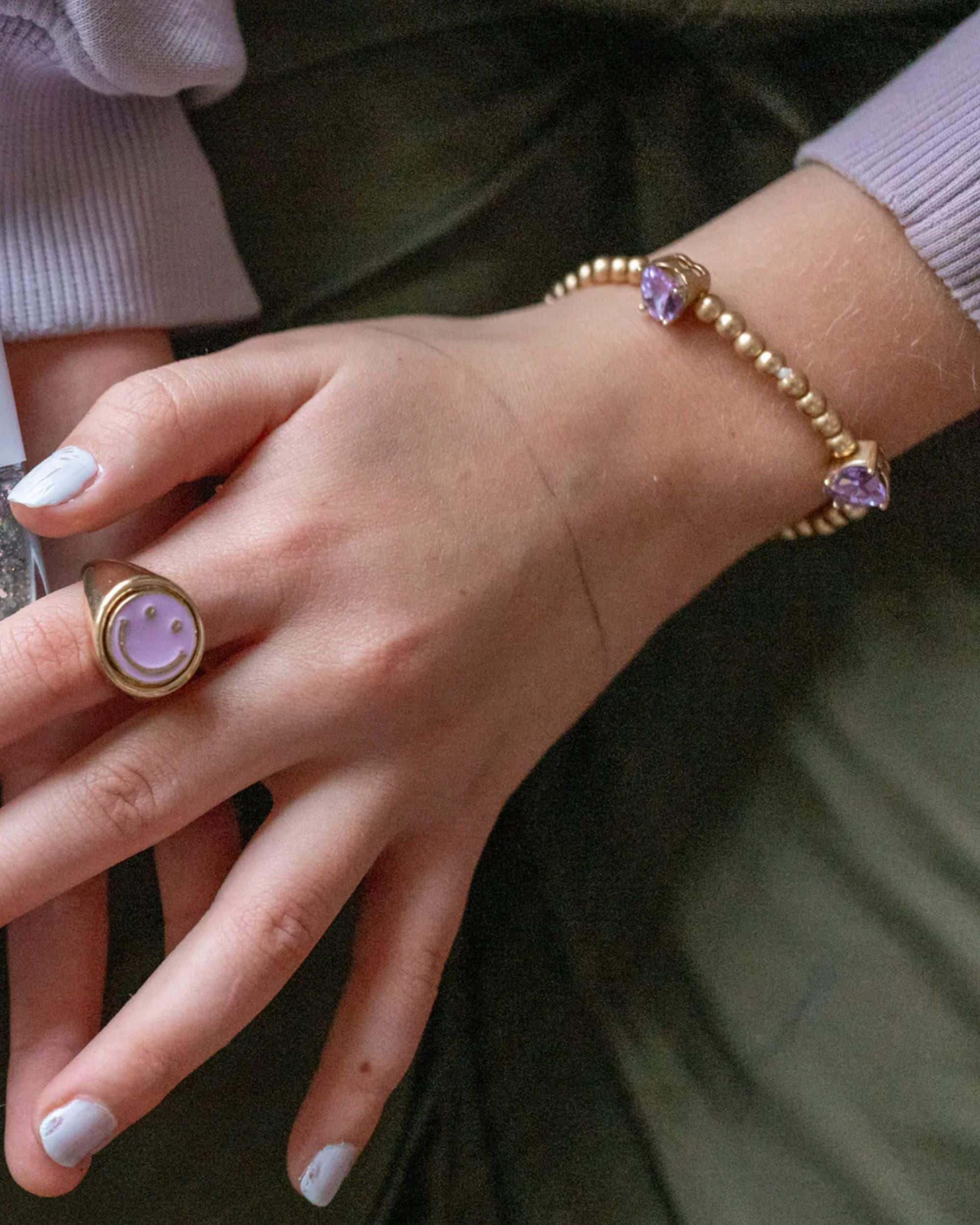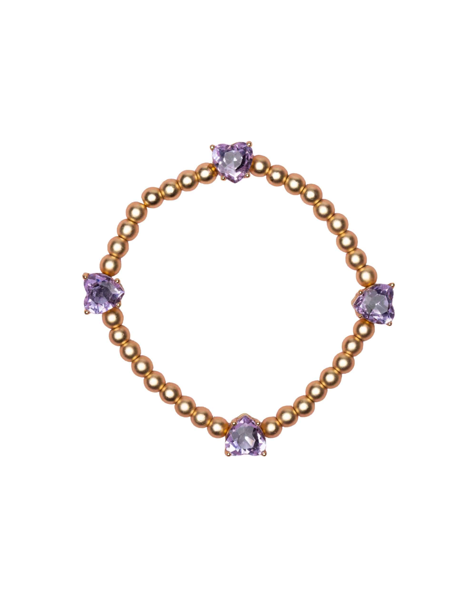 Boutique Chic Amethyst Love armband. Låt barnens armar lysa med Amethyst Love-armbandet! Detta charmiga smycke kombinerar guldpärlor med fyra ljuvliga lila hjärtstenar, vilket skapar en lekfull och glittrande look som barn älskar.
