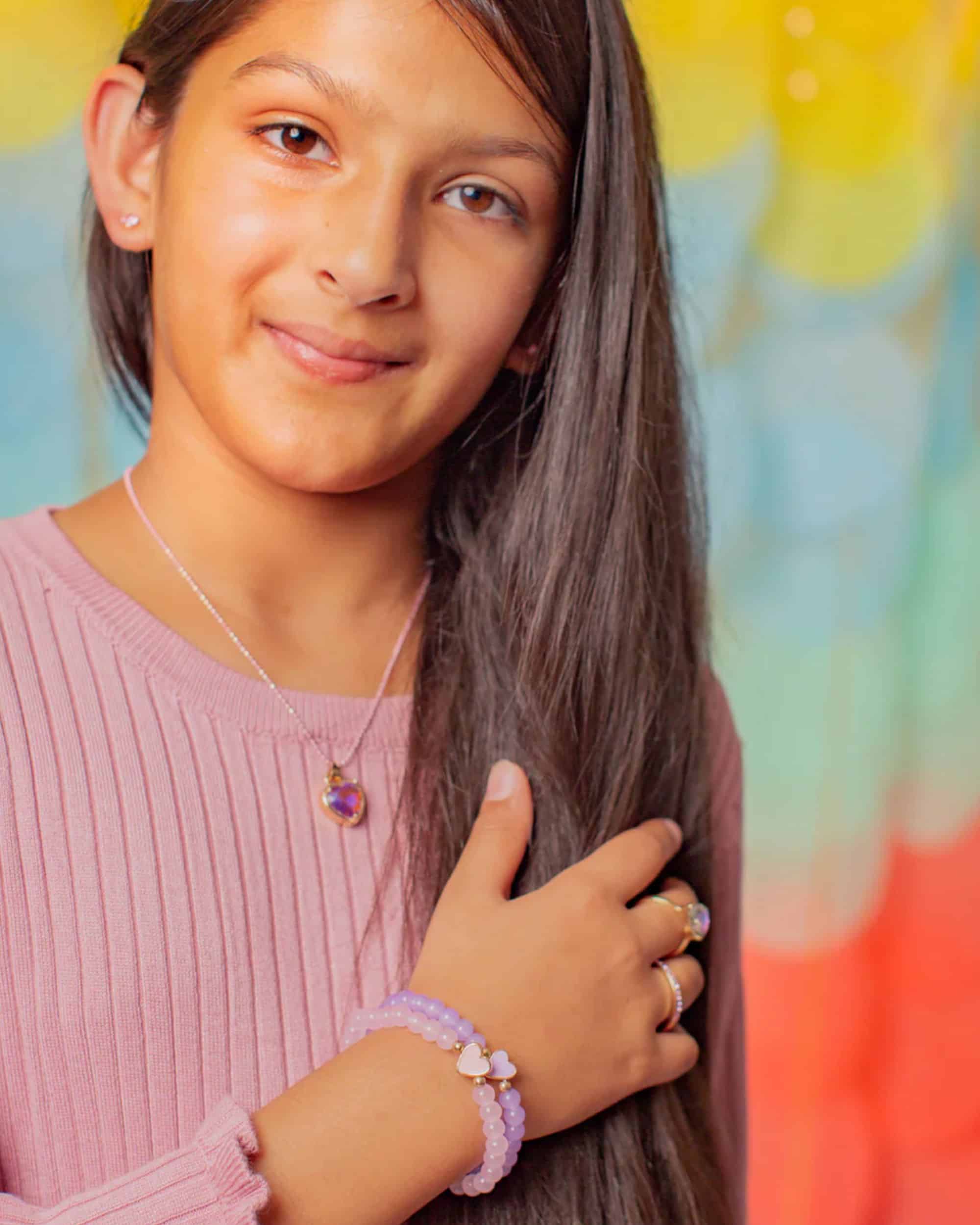 Boutique Chic With All My Heart armbandset. Dela kärlek och glädje med With All My Heart armbandset! Detta lekfulla set består av två elastiska armband i mjuka lavendel- och rosa nyanser, prydda med glansiga guldfärgade hjärtberlocker fyllda med matchande emalj. Kombinationen av färg och hjärtdetaljer skapar ett charmigt och fantasifullt smycke som barn älskar.