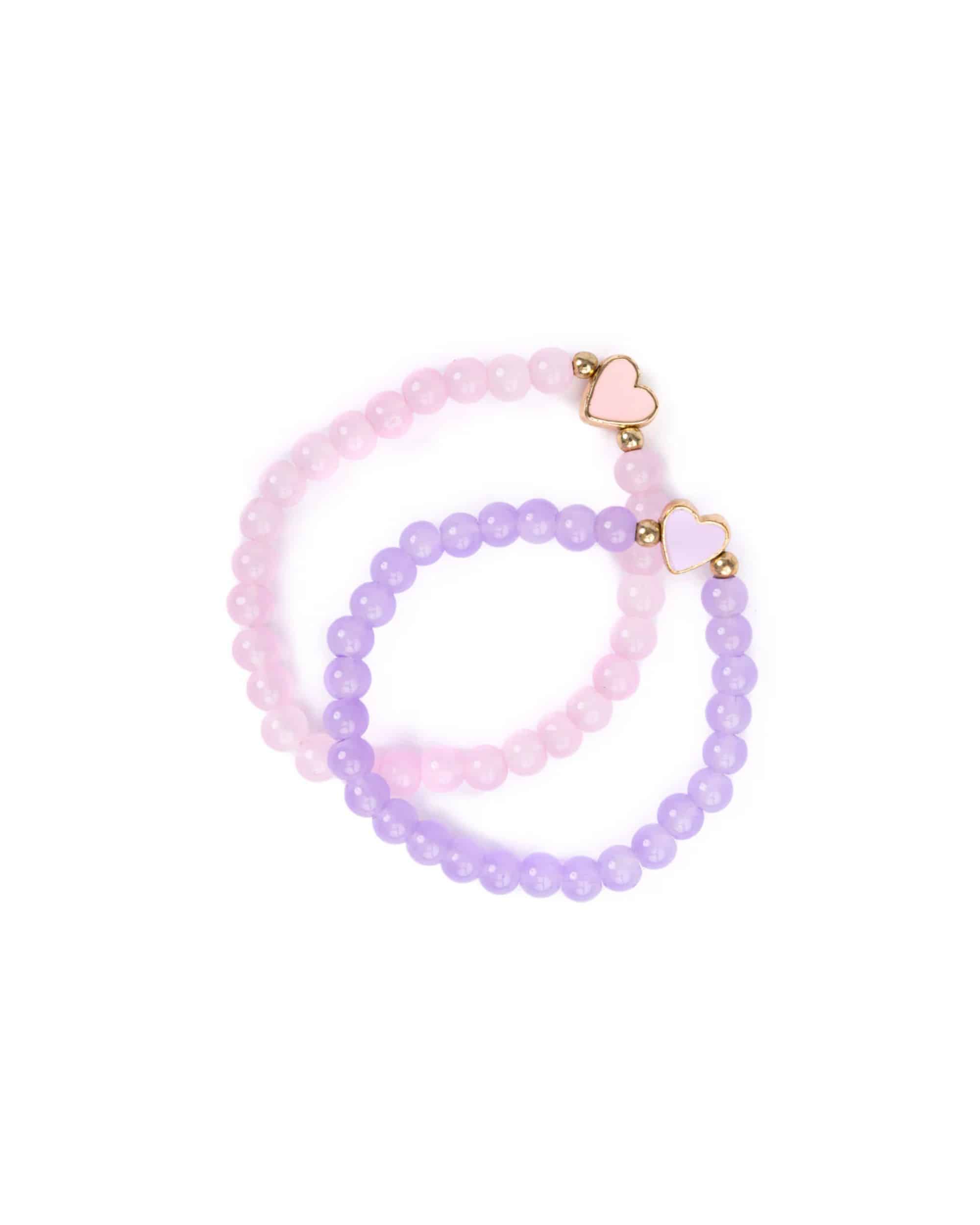 Boutique Chic With All My Heart armbandset. Två elastiska armband med glaspärlor i lavendel och rosa, dekorerade med guldfärgade hjärtberlocker. Perfekt för barn som vill leka med stil och glädje.