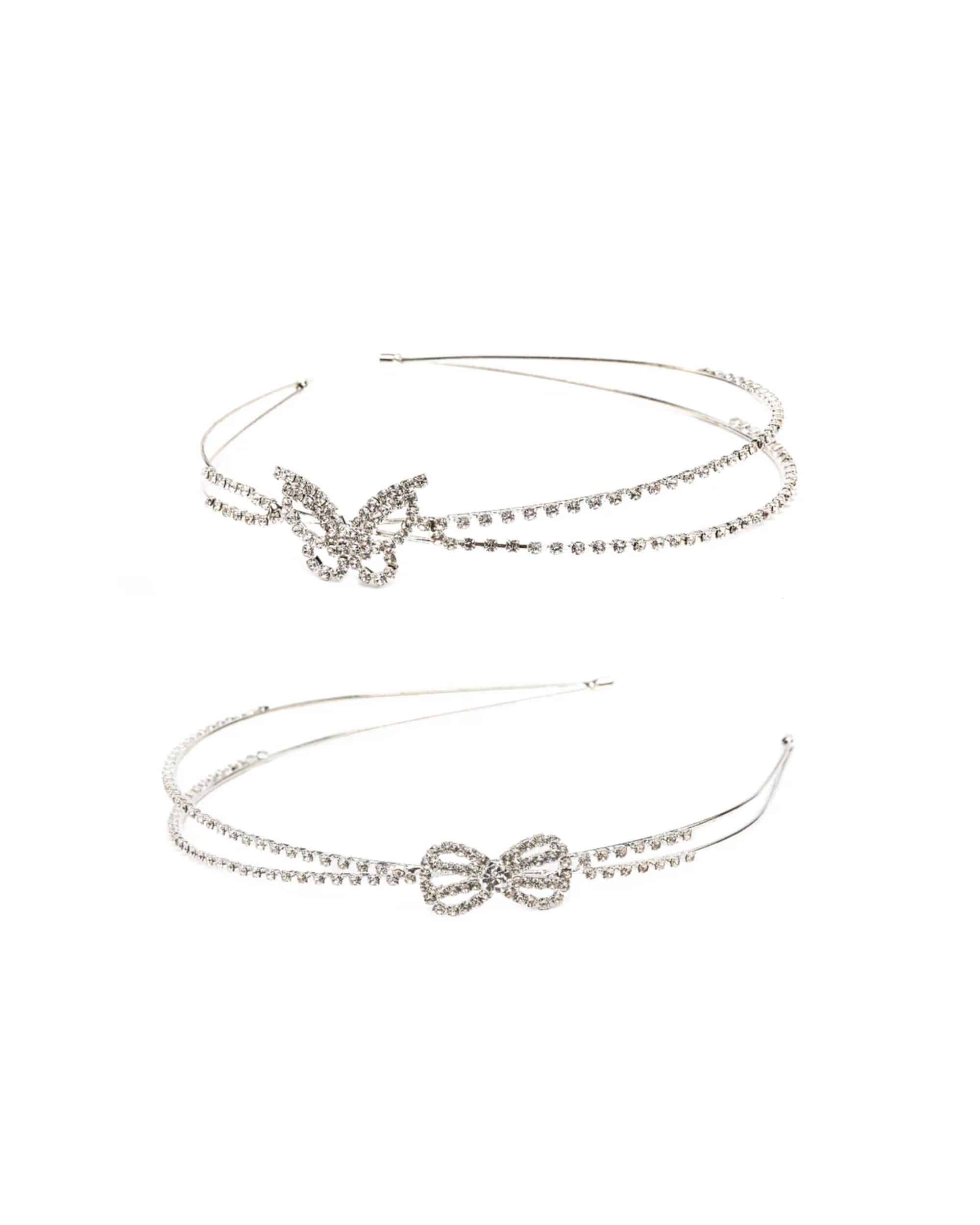 Fjärils/rosett diadem. Sprid glamour och lekfullhet med Fjärilsrosett Diadem! Detta charmiga diadem finns i två varianter: en söt fjäril och en ännu sötare rosett, båda dekorerade med små, glittrande kristallrhinestones som fångar ljuset på ett magiskt sätt. Resultatet blir ett fantasifullt smycke som barn älskar och som låter dem känna sig som små prinsessor.