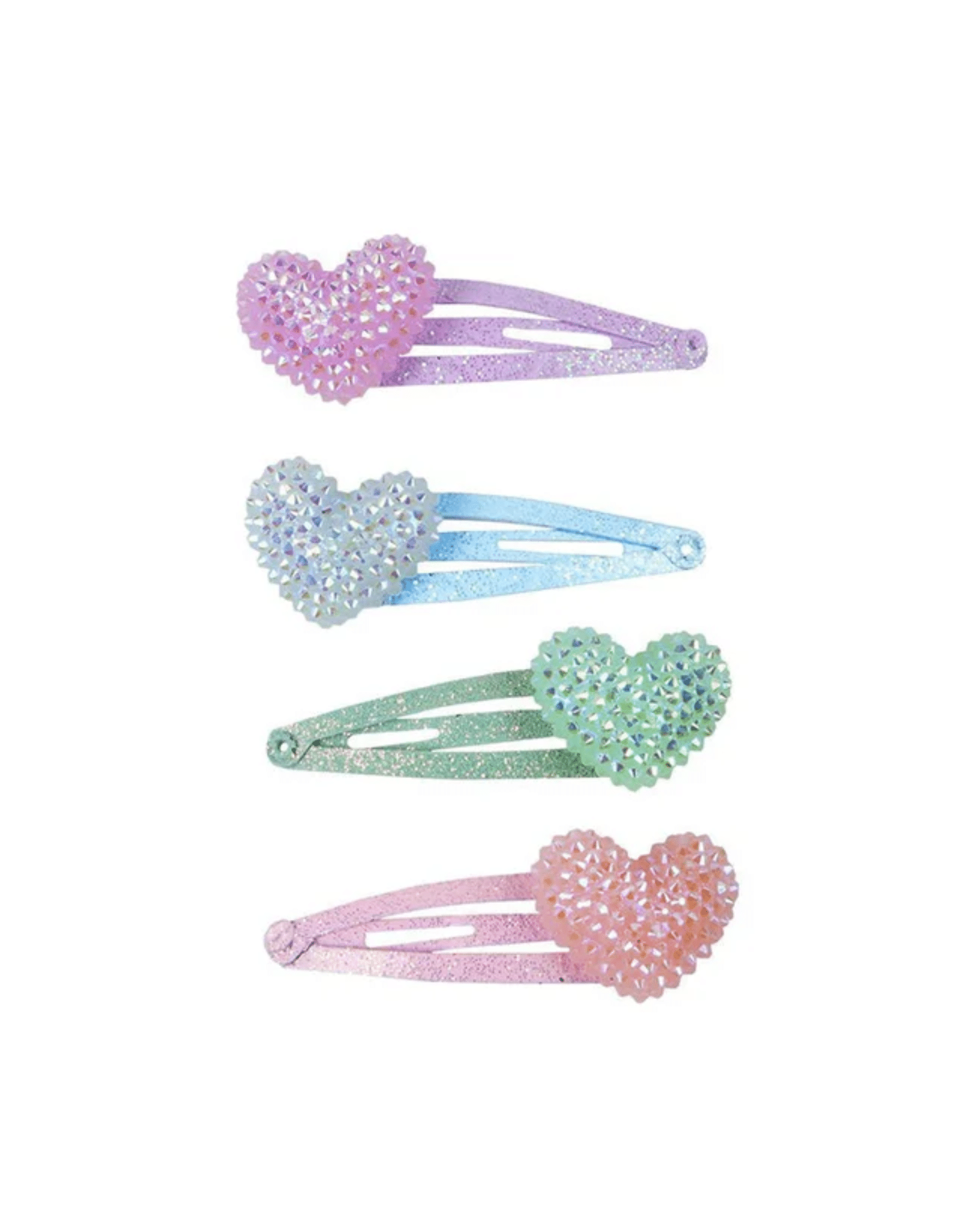 Ge din frisyr lite hjärta och glitter med vårt charmiga set med hjärtformade hårspännen. Detta set innehåller fyra glittriga spännen i färgerna rosa, lila, mint och blått, vilket gör det enkelt att mixa och matcha efter humör, outfit eller lektema.