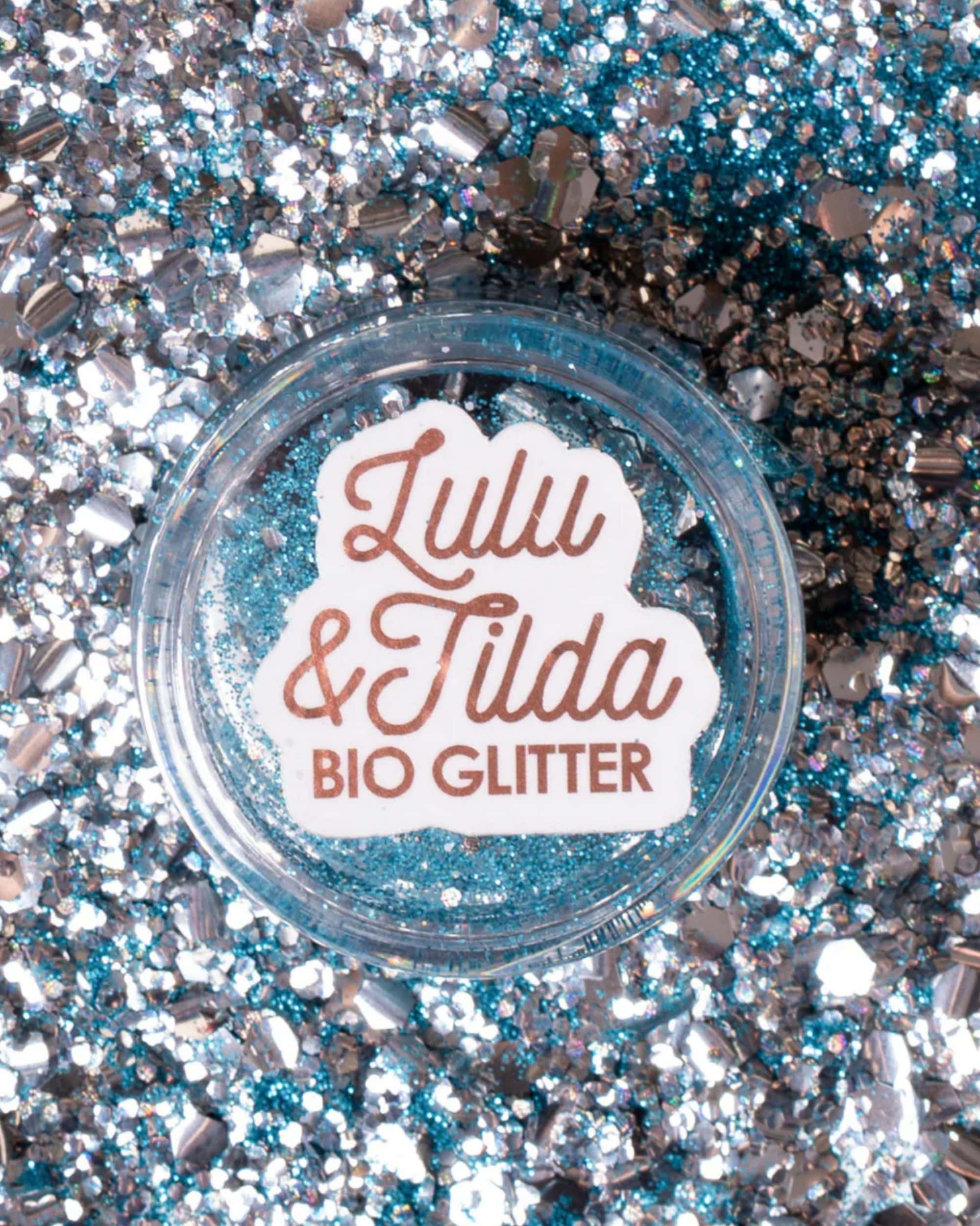 Den här blandningen kombinerar havsblått mikroglitter med större silverflingor. Färgerna reflekterar ljuset från alla vinklar och skapar ett skimmer som påminner om solljus över havet.