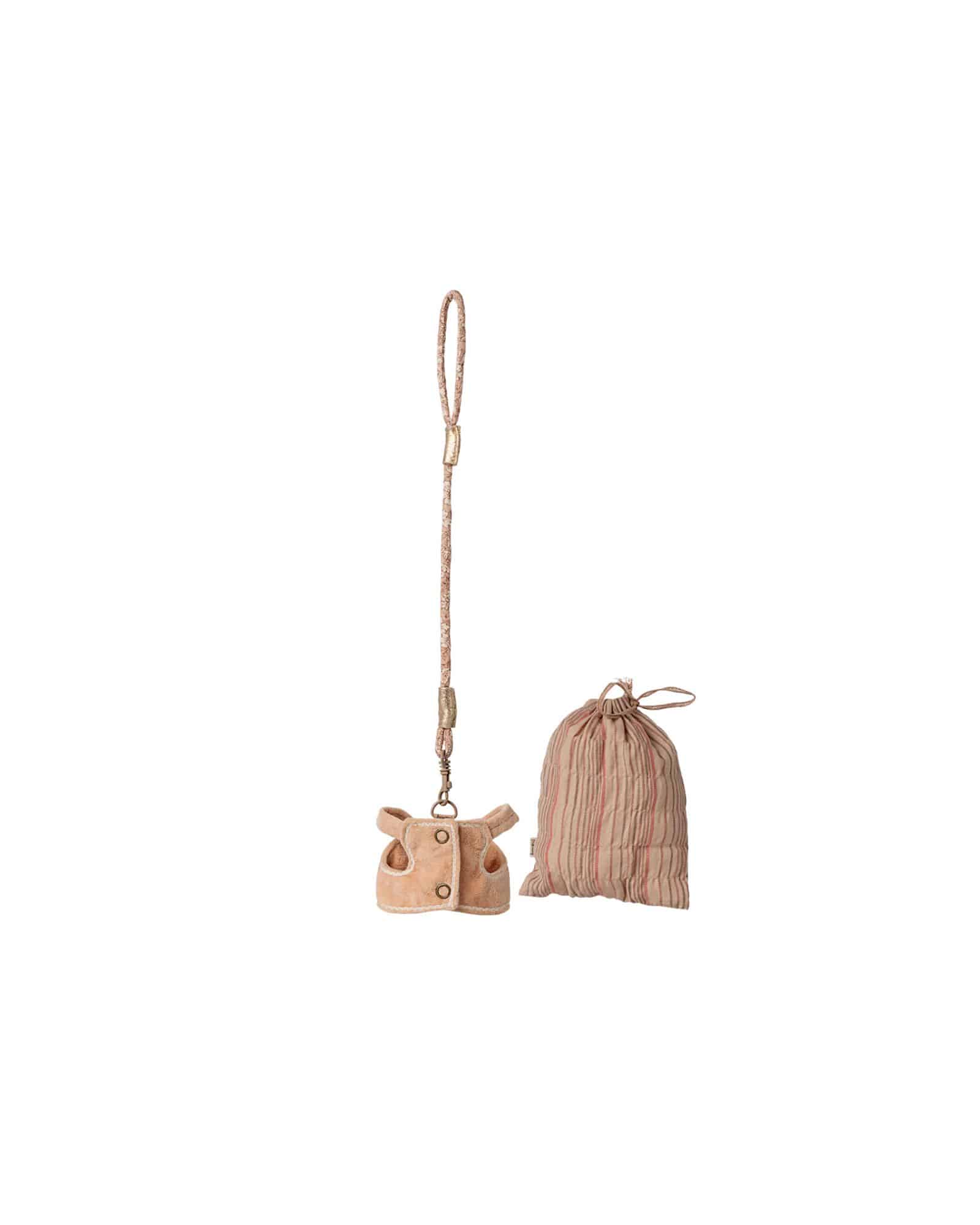 Setet innehåller en sele och ett matchande koppel. De är utformade för att passa Mailegs mindre mjukisdjur. Materialet är mjuk polyester som är skonsamt att använda. Tillbehören är också tåliga för daglig lek. Designen gör det enkelt för små händer att använda dem. Barnet kan själv sätta på selen och hålla i kopplet.
