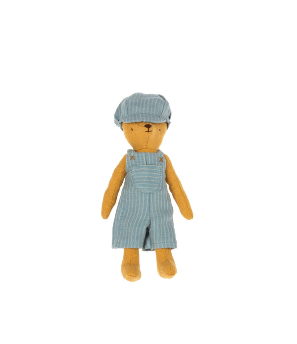 Maileg overall och keps Teddy Junior uppmuntrar till kreativ och fantasifull lek. Barn kan enkelt skapa egna berättelser och vardagssituationer genom att byta kläder och anpassa sina figurer efter olika roller. På så sätt utvecklar de både sin fantasi och sin finmotorik på ett naturligt och lekfullt sätt.