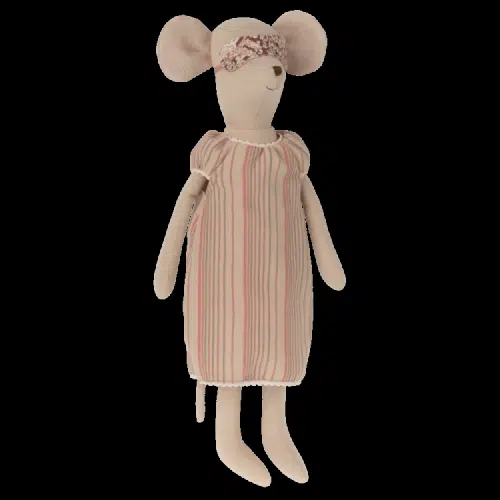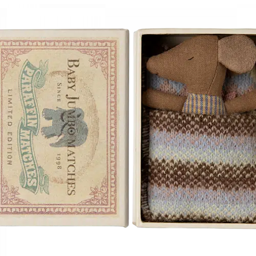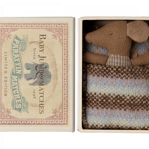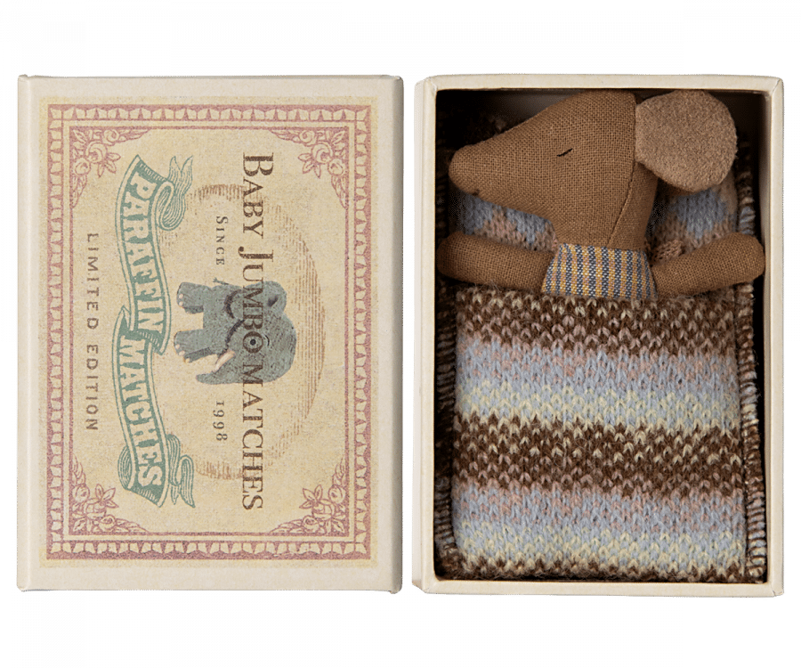 Ett klassiskt Maileg-objekt. Denna mus är redo för timmars lek och sover gott i den lilla tändsticksasken. Kläderna och sängkläderna är gjorda av mjuka tyger med unika tryck i vackra färger.
