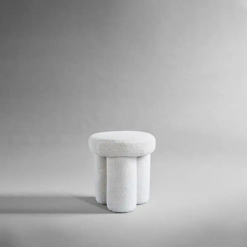 Den enkla palldesignen består av tre runda ben och ett runt mjukt säte, alla ytor klädda med naturligt fårskinn i färgen off-white.
