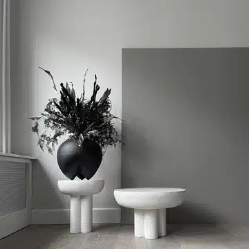 Samlingen av bord med titeln Crown är gjutna i ett stycke formad som en cirkulär bordsskiva som bärs av fyra cylinderformade ben. Står starkt och stolt, är bordet inspirerat av de kala, strukturella elementen i brutalistisk arkitektur, hyllar kolonnerna och undviker en attityd till för många detaljer. De tjocka fiberbetongbenen möjliggör ett stort mellanrum mellan bordskanten och benen för att understryka upplevelsen av en massiv flytande bordsskiva. Bordet finns i två storlekar och kan användas som ett enkelt stående sidobord eller stå tillsammans som ett par soffbord.