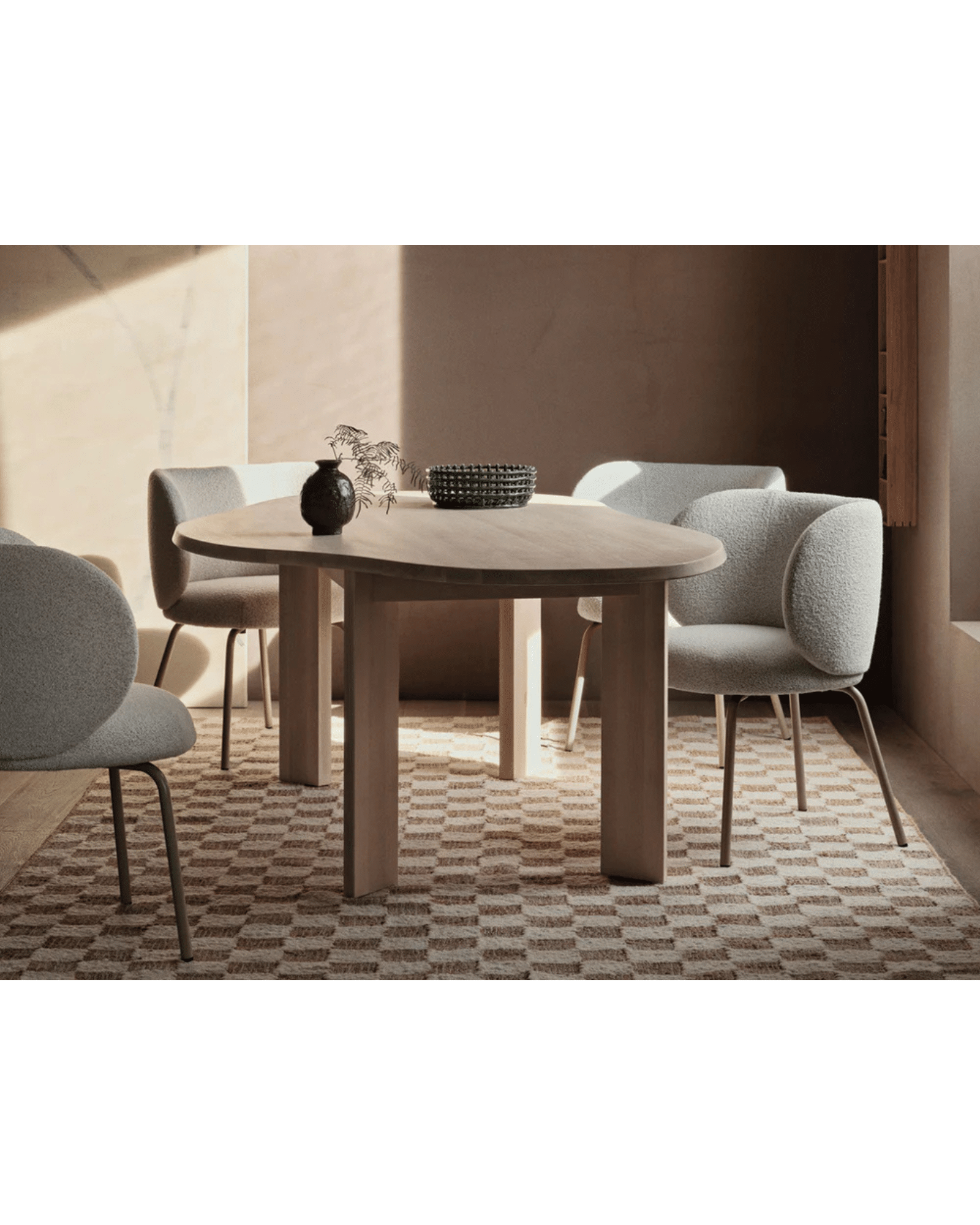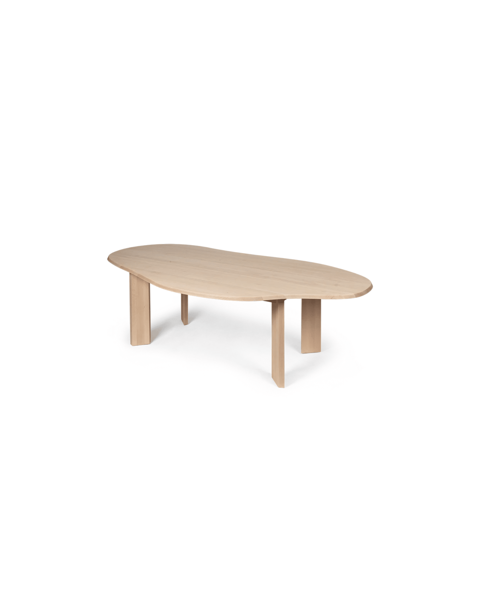 Den organiskt formade bordsskivan skapar ett mjukt och harmoniskt uttryck, medan den fasade kanten ger designen en elegant detalj. Bordet vilar på fyra breda, linjära ben som ger en stabil konstruktion och samtidigt skapar en vacker kontrast till bordsskivans mjuka linjer.