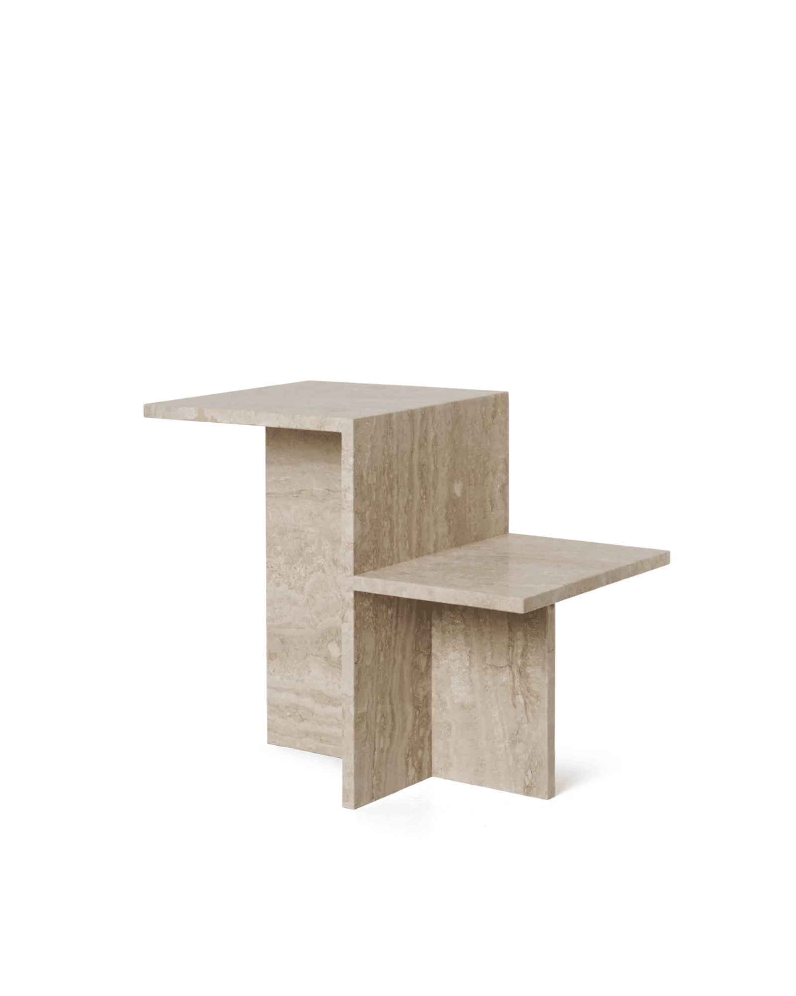 Tillverkat i travertin – en sandfärgad kalksten – får bordet ett levande och naturligt uttryck. De subtila variationerna i stenens struktur och ton gör varje exemplar unikt och ger en exklusiv känsla till rummet.