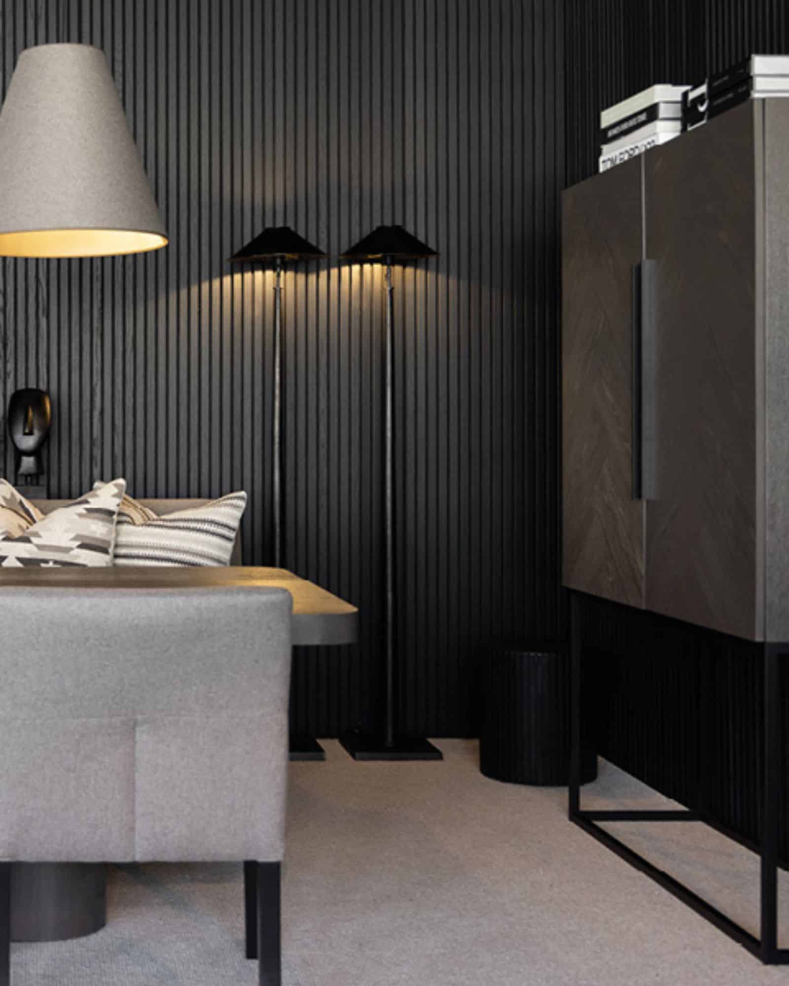 Den mörkgrå finishen ger skåpet en modern och tidlös karaktär som passar lika bra i vardagsrum, matsal eller hall. Ben och handtag i mattsvart stål skapar en stilren kontrast till träets struktur och bidrar till en balanserad och modern design.