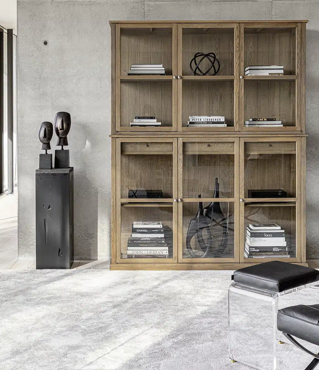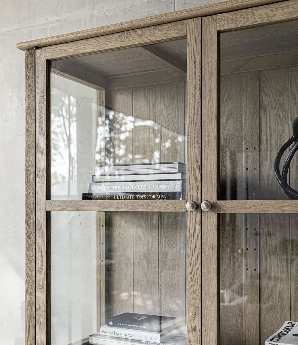 Vitrinskåpet Denver från Artwood består av massiv ek samt ekfanér som är vaxbehandlat. Eken har lämnats ute i väder och vind för att åldras innan tillverkning och har under produktionen fått flera vaxbehandlingar vilket gör att en viss sprickbildning uppstår för att få den vackra patinan. Varje Denver skåp är unik. Skåpet har sex dörrar med tolv delade glasrutor och tre lådor.