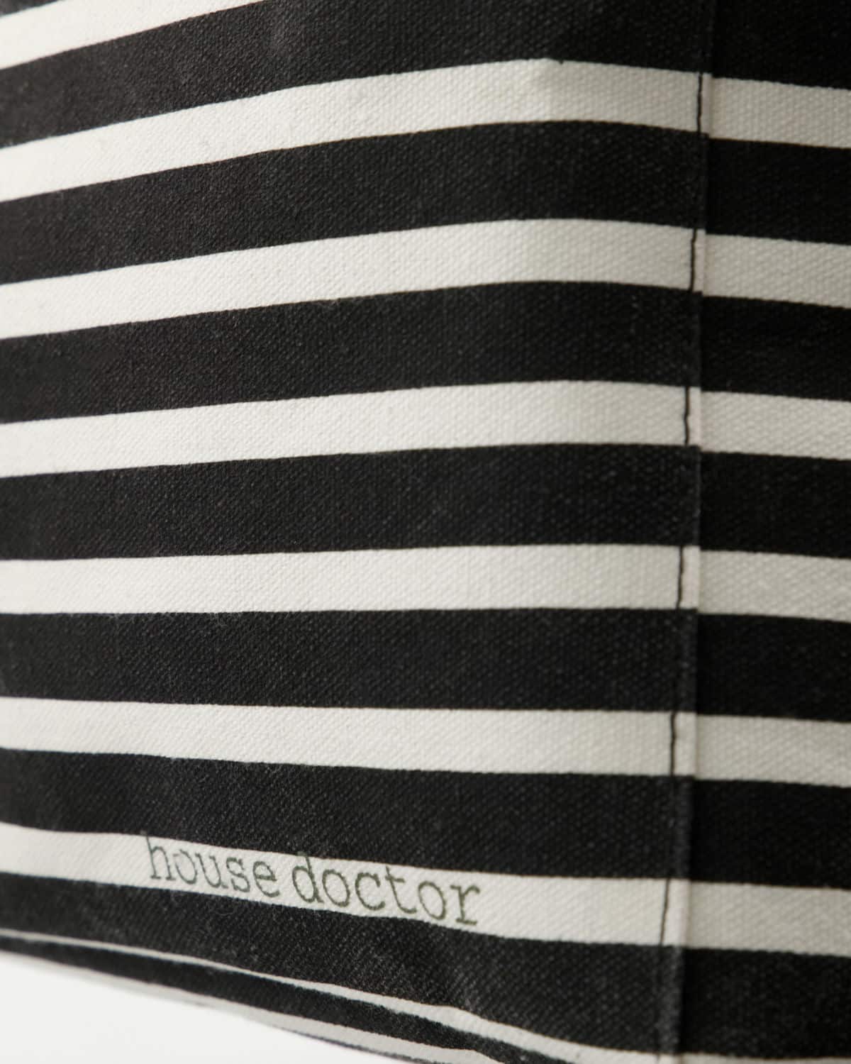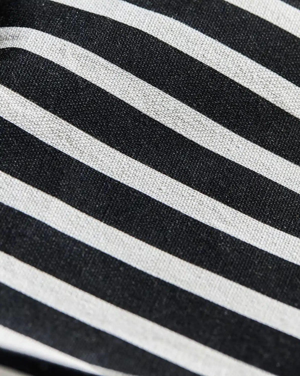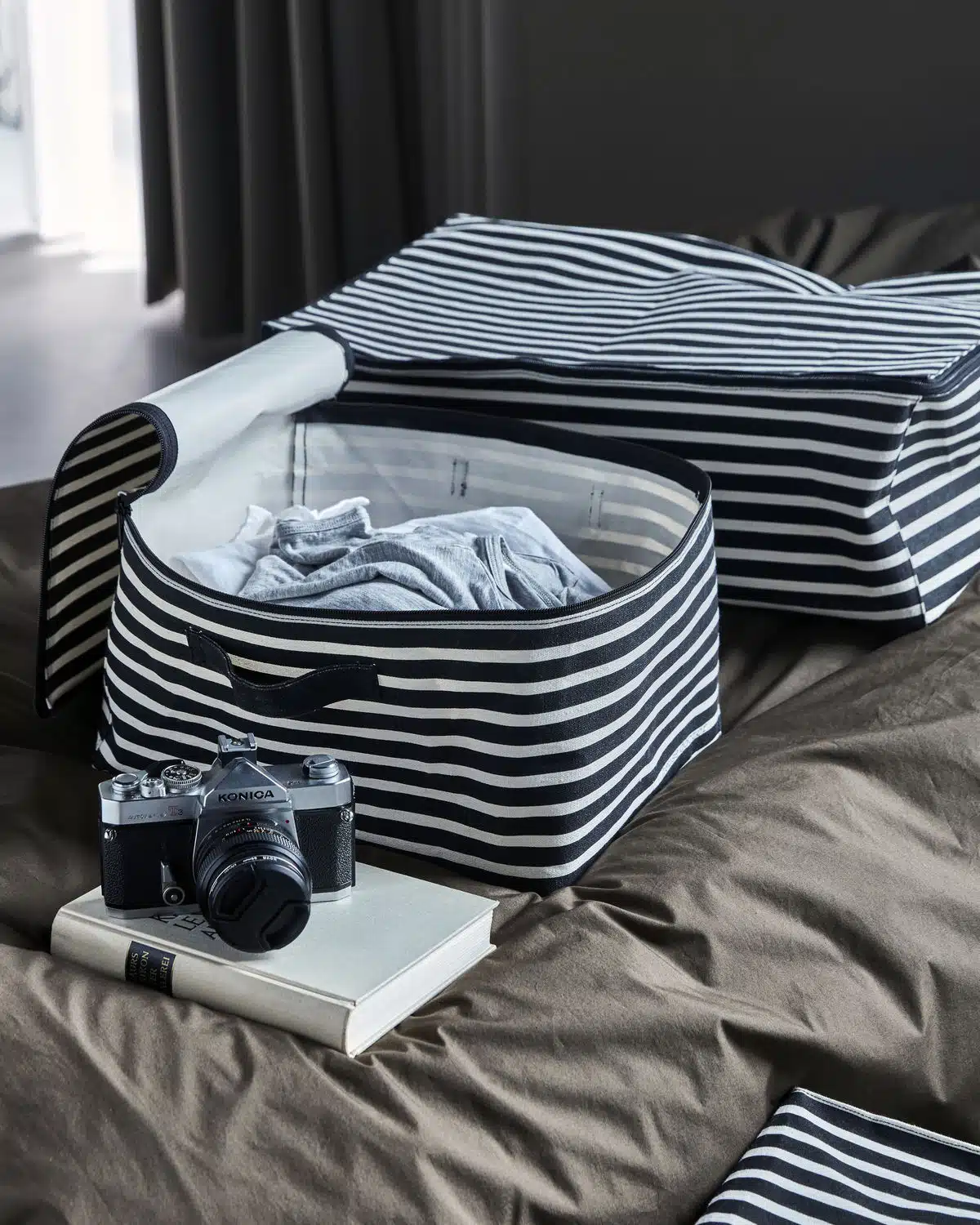 Denna eleganta förvaringslåda, tillverkad av en blandning av polyester, bomull och polyeten, har en stilren svart och offwhite randig design. Med sin långa dragkedja erbjuder den en praktisk och estetisk lösning för att organisera dina tillhörigheter.