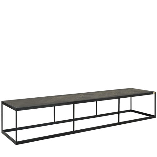 Konsolbordets hyllplan är tillverkade av ekfanér och pryds av ett vackert fiskbensmönster, vilket ger bordet en exklusiv och detaljrik känsla. Dessutom kombineras de varma trätonerna med en tunn mattsvart metallstomme, som både skapar en luftig design och ger en stabil konstruktion. På så sätt får du ett bord som är både vackert och praktiskt.