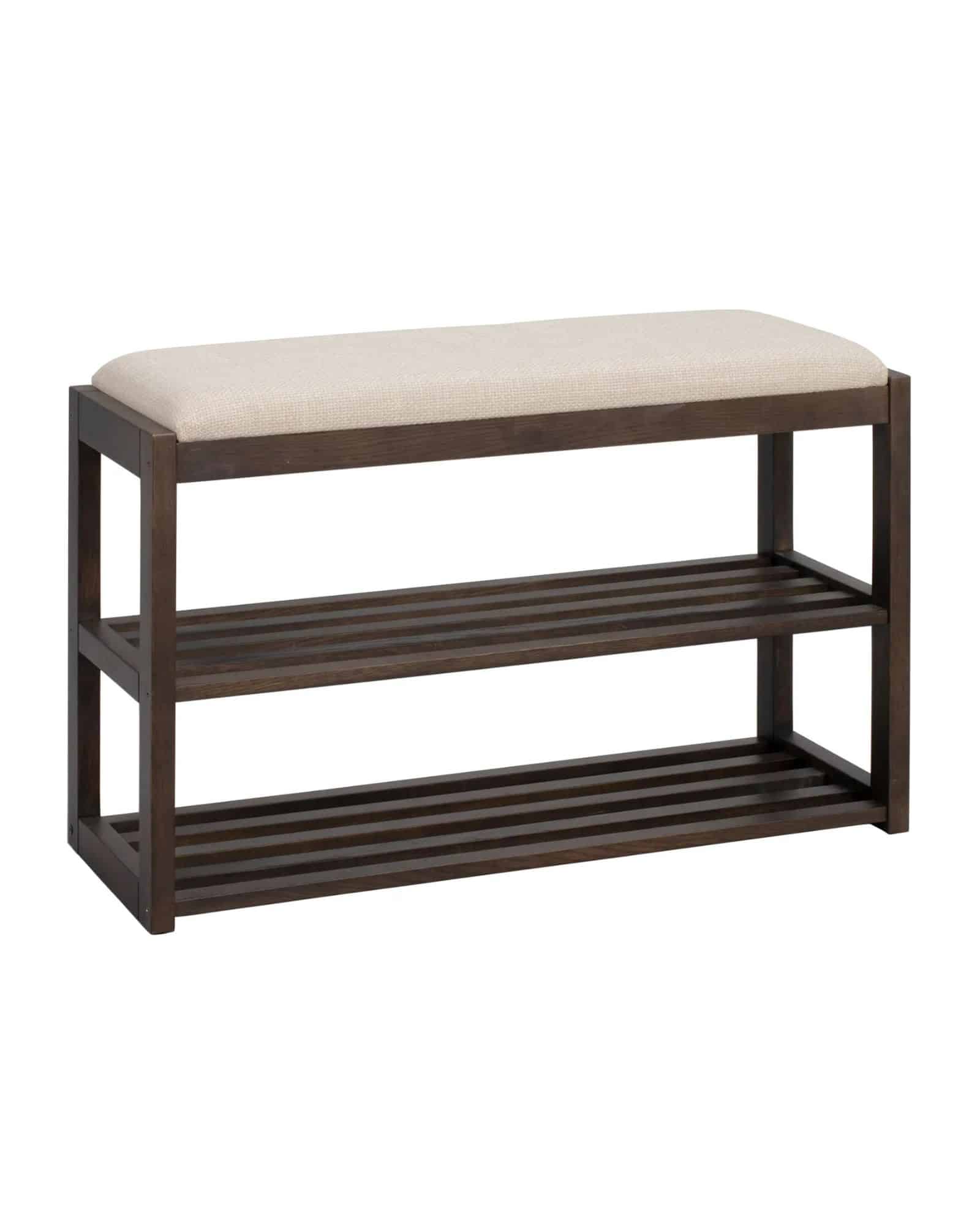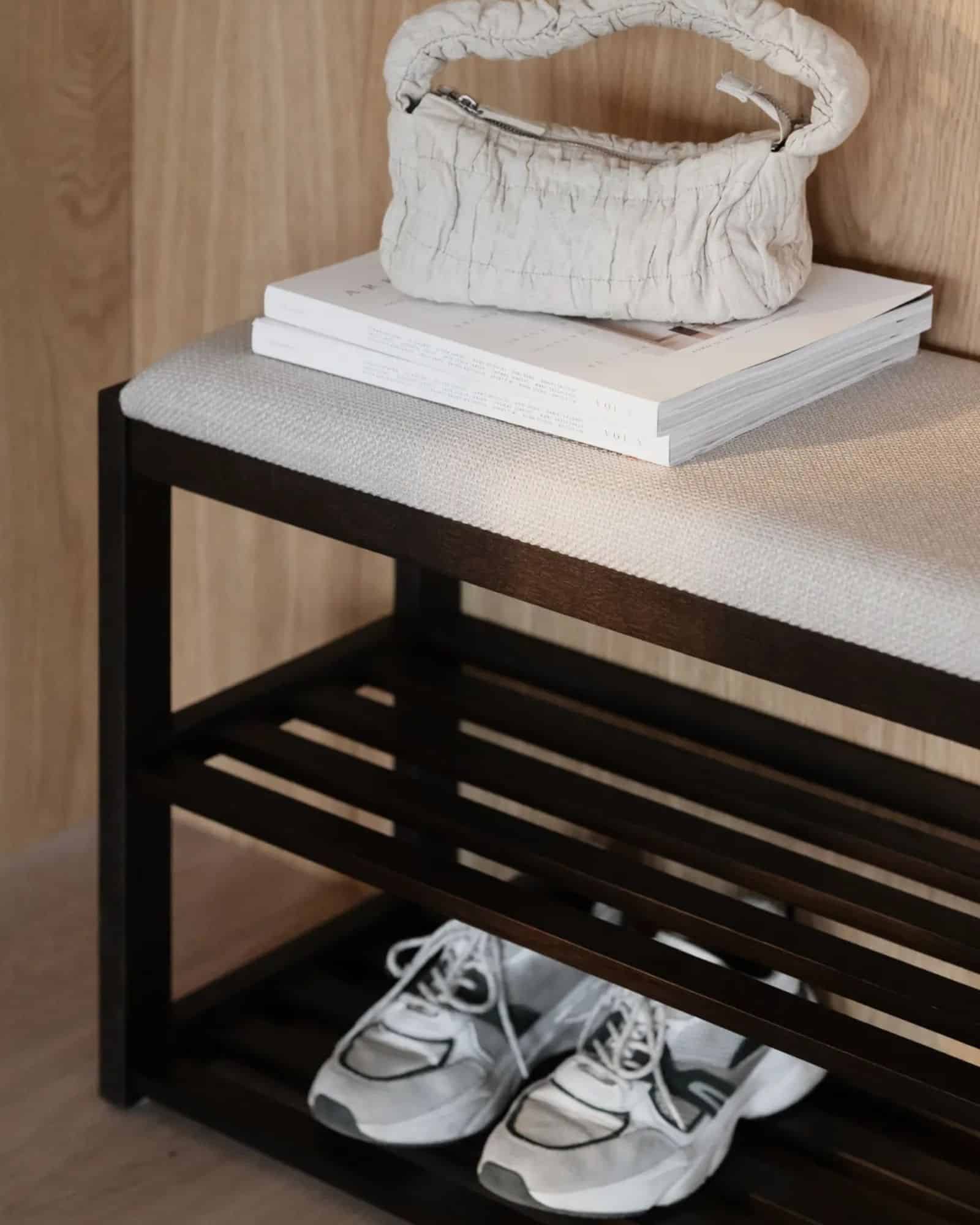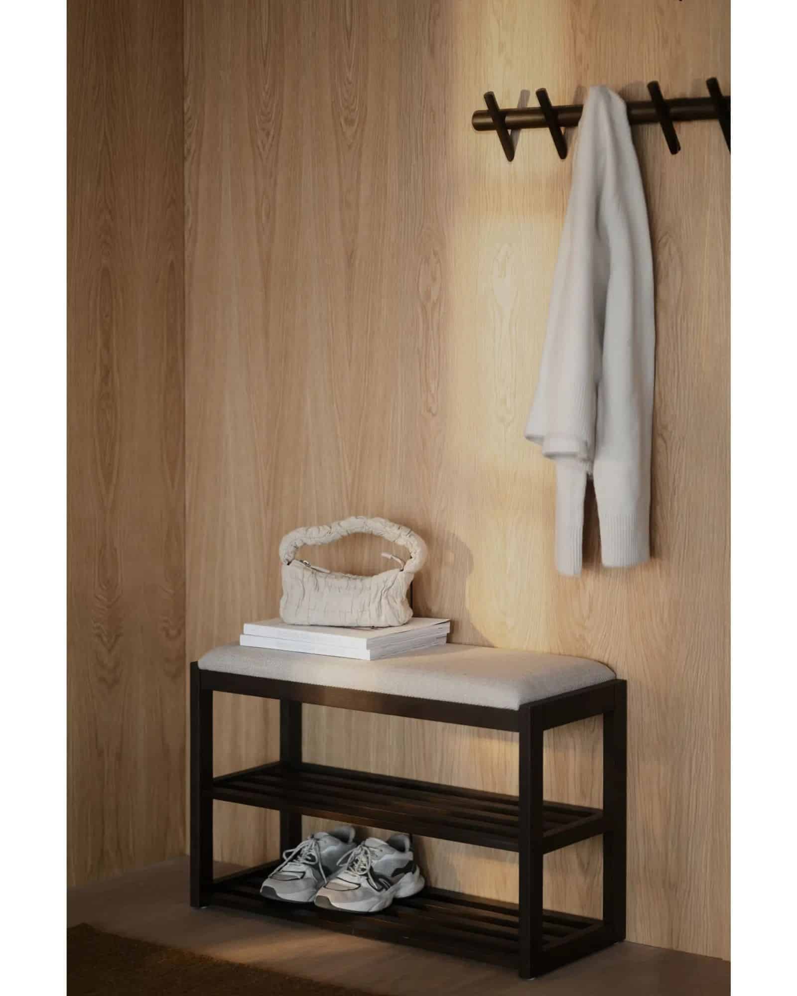 Under sitsen finns två rymliga lådor som gör det enkelt att hålla ordning på exempelvis mössor, vantar eller andra småsaker. På så sätt får du både sittplats och praktisk förvaring i en och samma möbel.