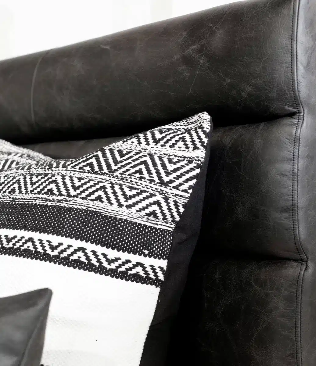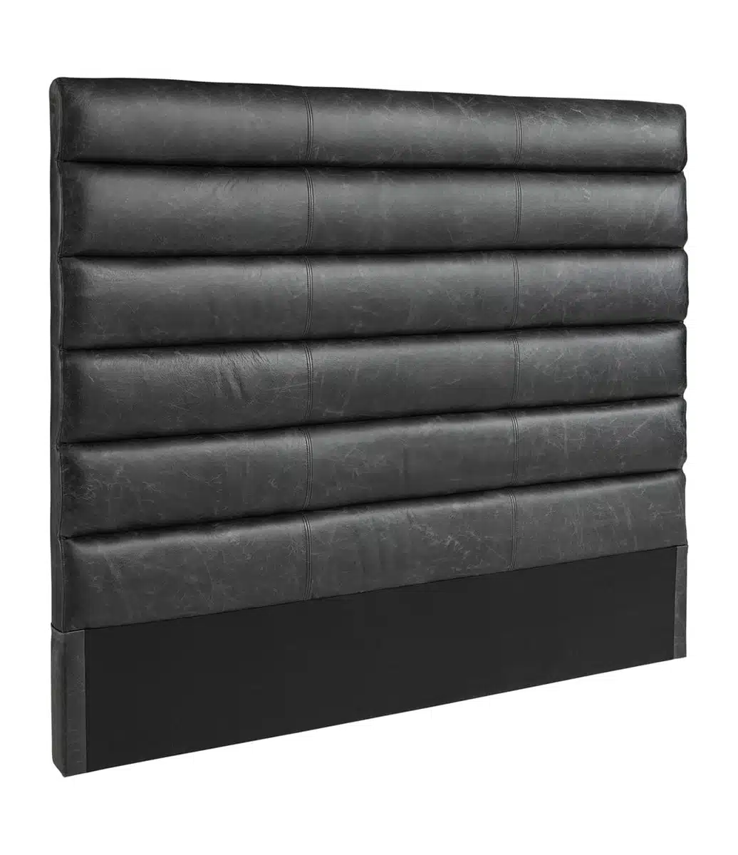 En sänggavel i svart läder eller sandfärgat linnetyg.
