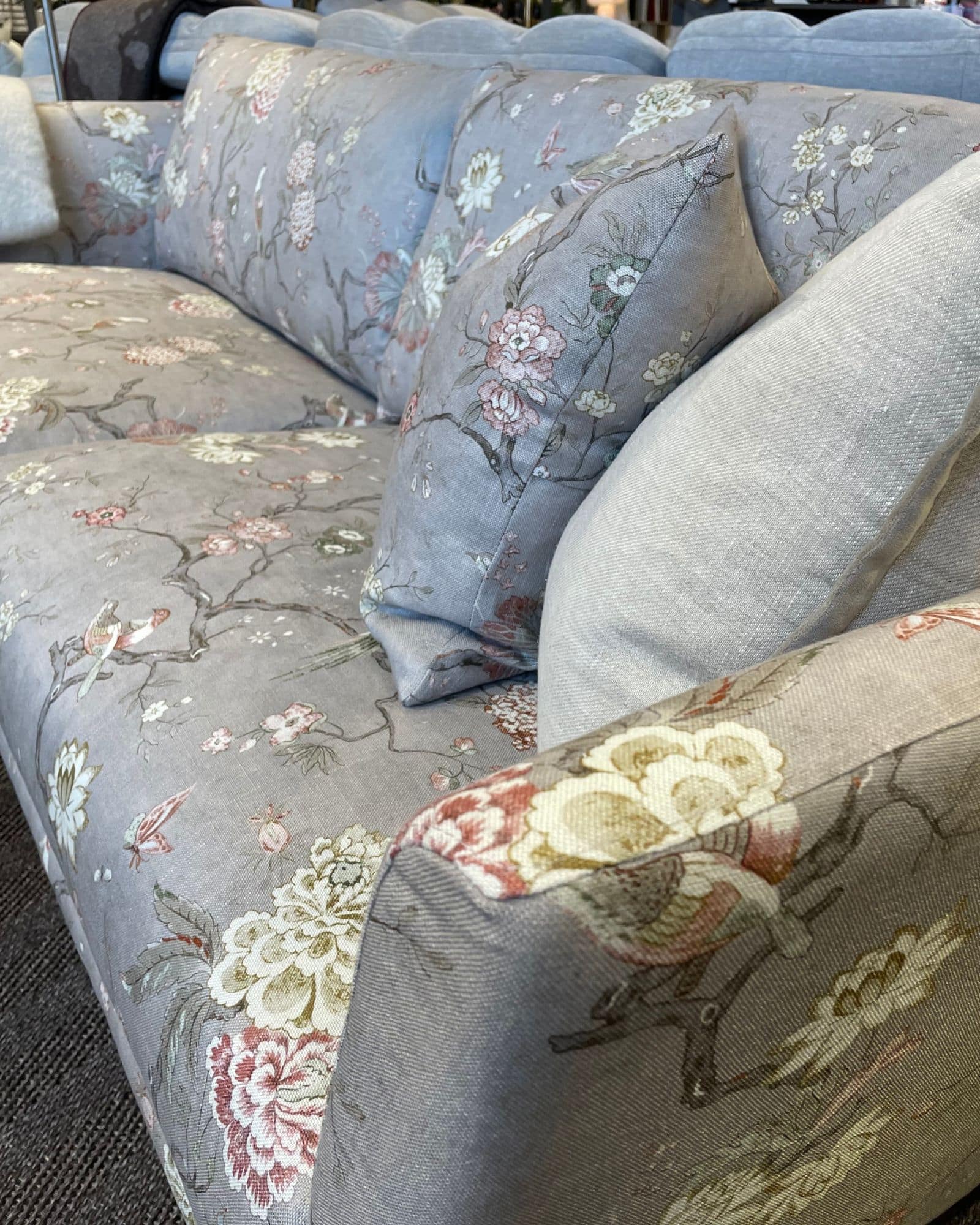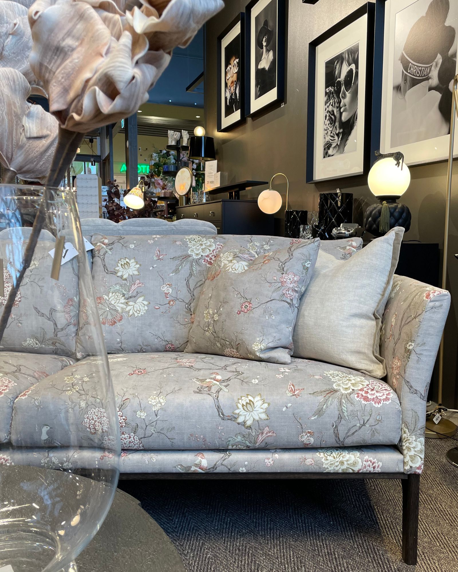Denna variant är klädd i tyget Oriental Bird 4 Grå, ett dekorativt och sofistikerat tyg som tillför karaktär till rummet. Ben i wengebets förstärker soffans eleganta helhetsintryck och ger en djup, exklusiv ton.