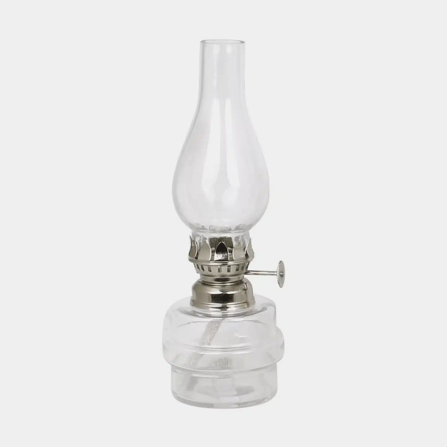 Mindre fotogenlampa i klarglas med brännarerör i klarglas och brännare i nickel. Inklusive en veke