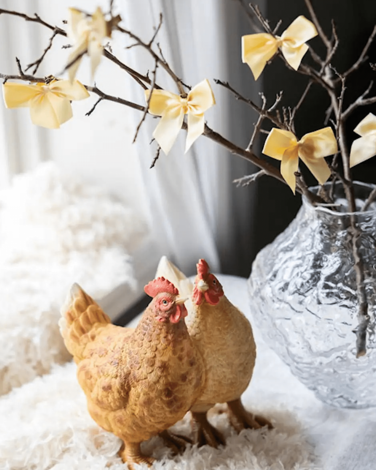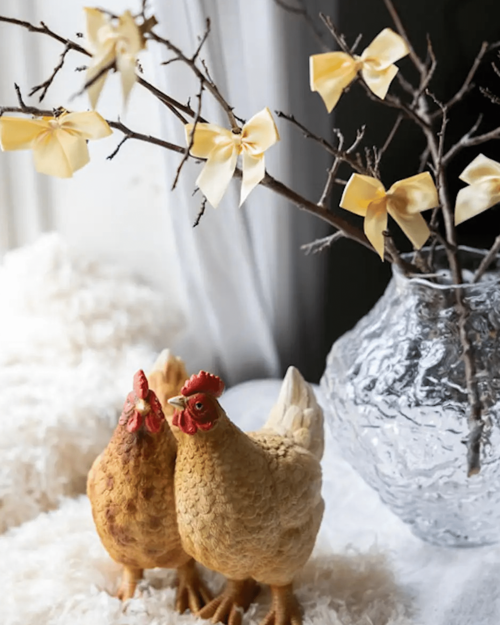 Ställ hönorna på soffbordet, hyllan, fönsterbrädan eller som mittpunkt i ett större påskarrangemang. Dessutom kan du kombinera dem med blommor, ljus eller andra dekorationer för att skapa ett personligt och harmoniskt uttryck. På så sätt blir Dekoration Hönsduo både en dekorativ detalj och ett lekfullt inslag som sprider glädje i hemmet.