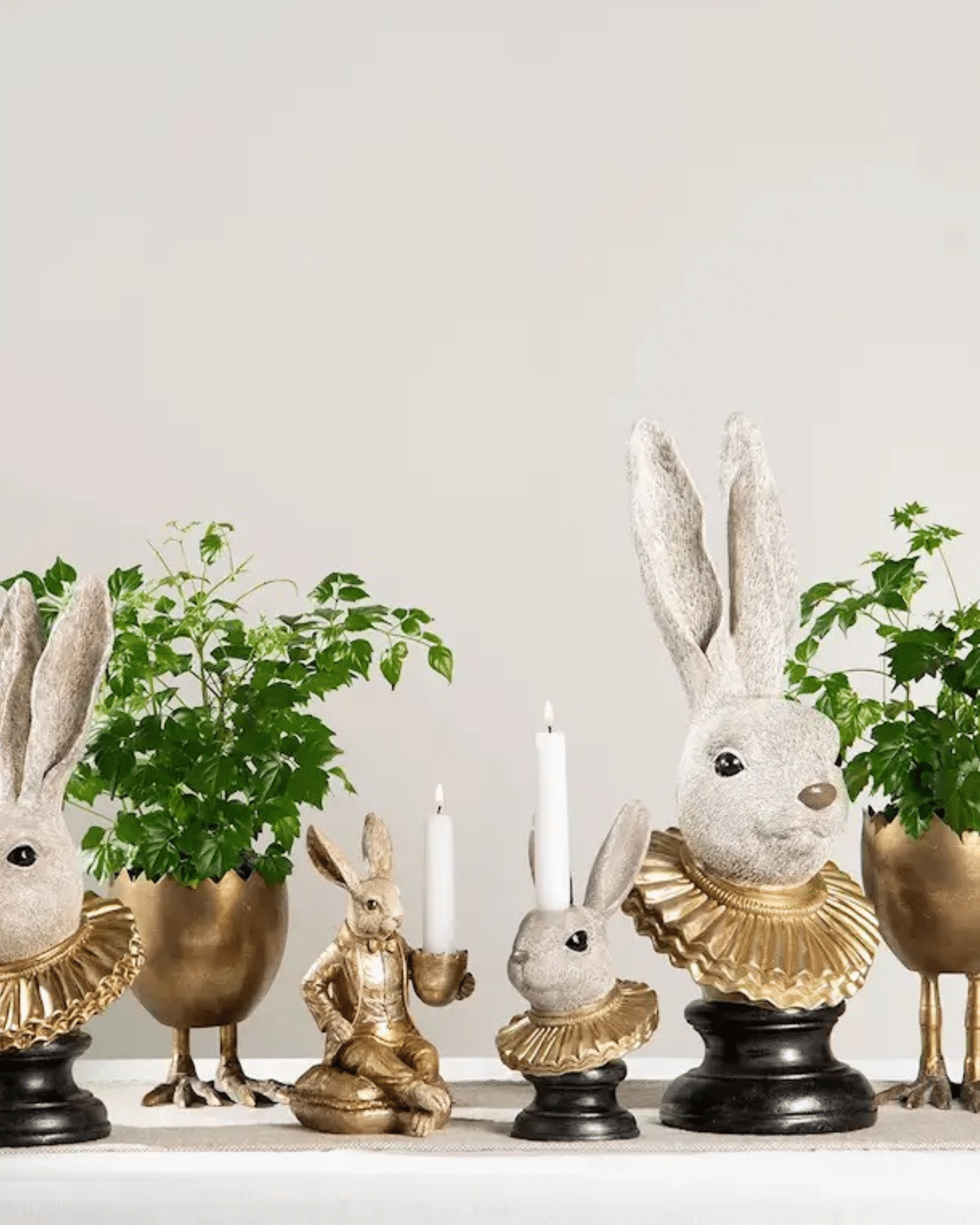 Ljushållaren är tillverkad i poly, vilket gör den både lätt och hållbar. Med måtten 13x15x21 cm får du en kompakt men tydlig dekoration som passar på de flesta ytor utan att ta för mycket plats. Tack vare den guldiga färgen blir Ljushållare Herr Kanin ett elegant inslag som passar både moderna och klassiska hem.