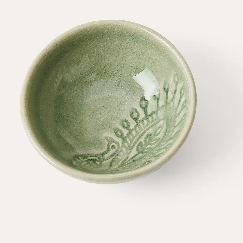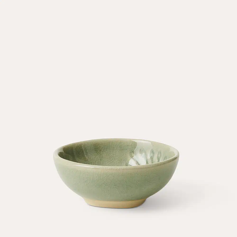 Den lilla skålen med de stora möjligheterna. Den här är liten men minst naggande go att hands. Den passar allt möjligt. Flingsaltet, dippsåsen eller sojan. Antikgrön är en så kallad effektglasyr. Den har små fina krackeleringar som ger liv och variation åt keramiken.