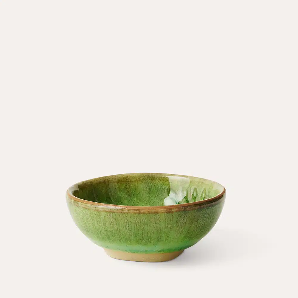 Skål för alla. Ja, den här lilla skålen kan dukas fram till alla. Var och en kan få sin egen skål på sin mattallrik med sås eller soja i. Den lilla skålen kan också leva ett eget liv på bordet och rymma smör eller salt i. Färgen heter sjögräsgrön och är en rinnig glasyr som ger variationer och liv.