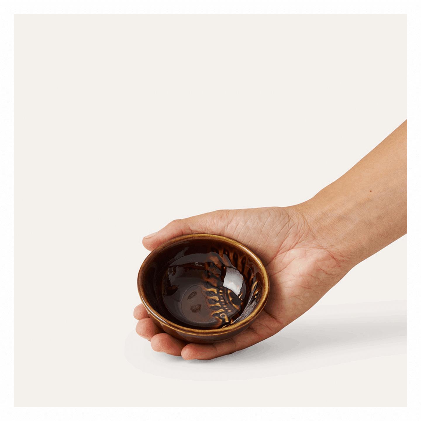 Skålar kan man aldrig få nog av. En liten skål får många användningsområden. Bra till sås, klippt gräslök eller en klick gräddfil. Som en liten färgklick på bordet. Kaffebrun är en glasyr i varm brun ton. Glasyren flödar över keramiken och ger spännande skiftningar och nyanser. Den får också mönstret i keramiken att teckna framträda vackert.