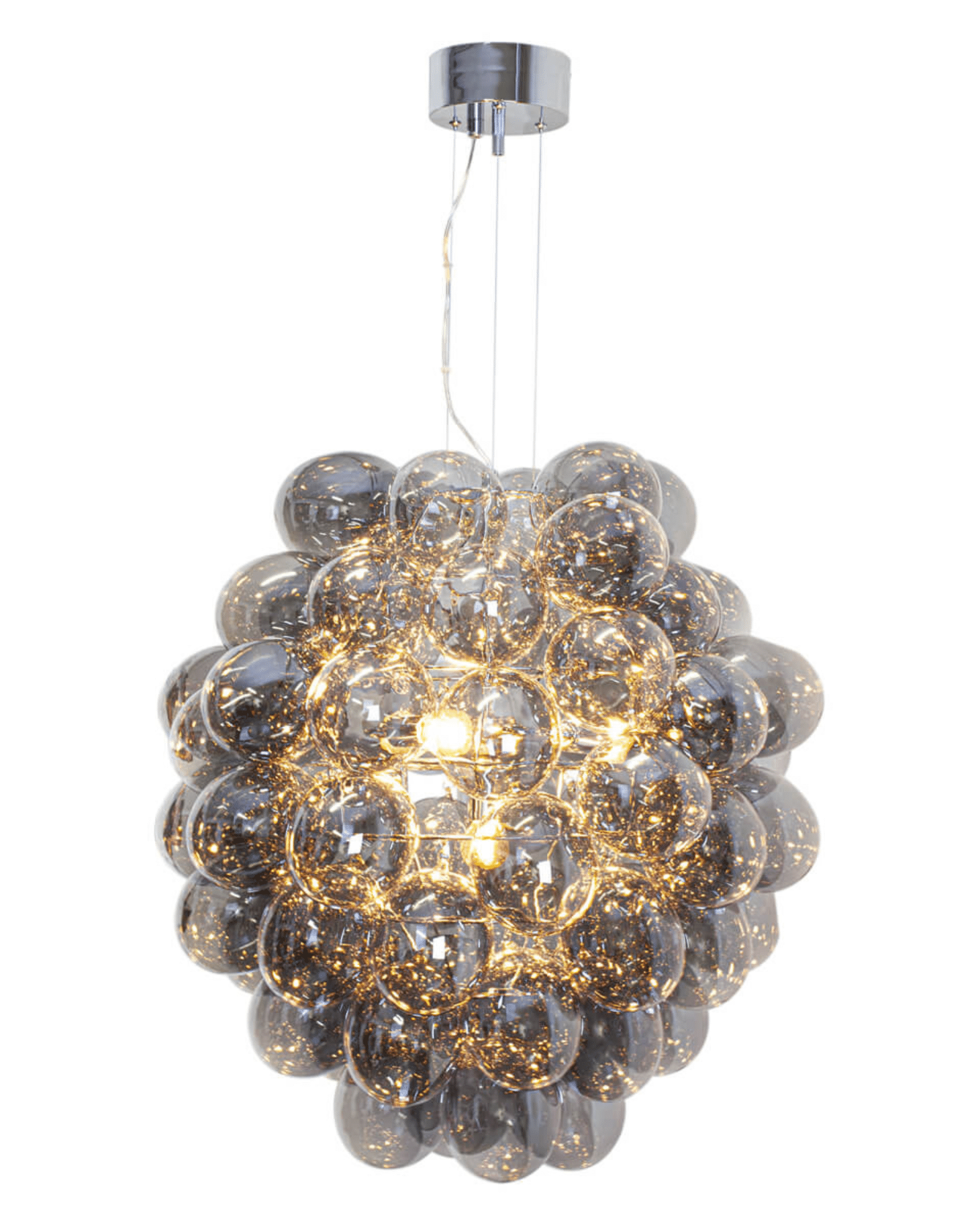 Upptäck By Rydens Deluxe taklampa grå – en magnifik taklampa som förenar modern design med tidlös glamour. Den består av hela 60 glaskulor i en elegant ljusgrå ton som reflekterar ljuset och skapar ett vackert, levande sken i rummet.