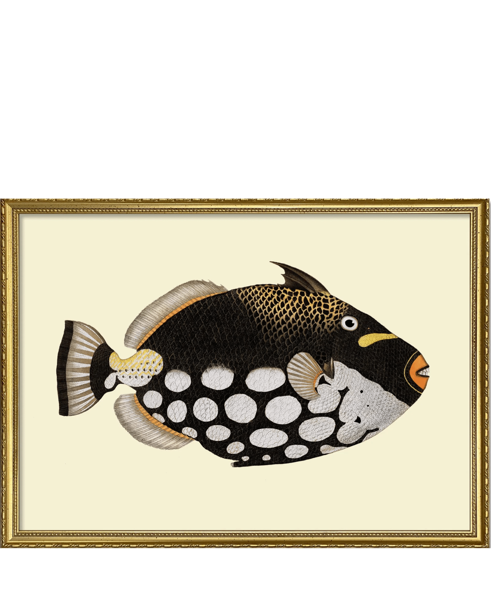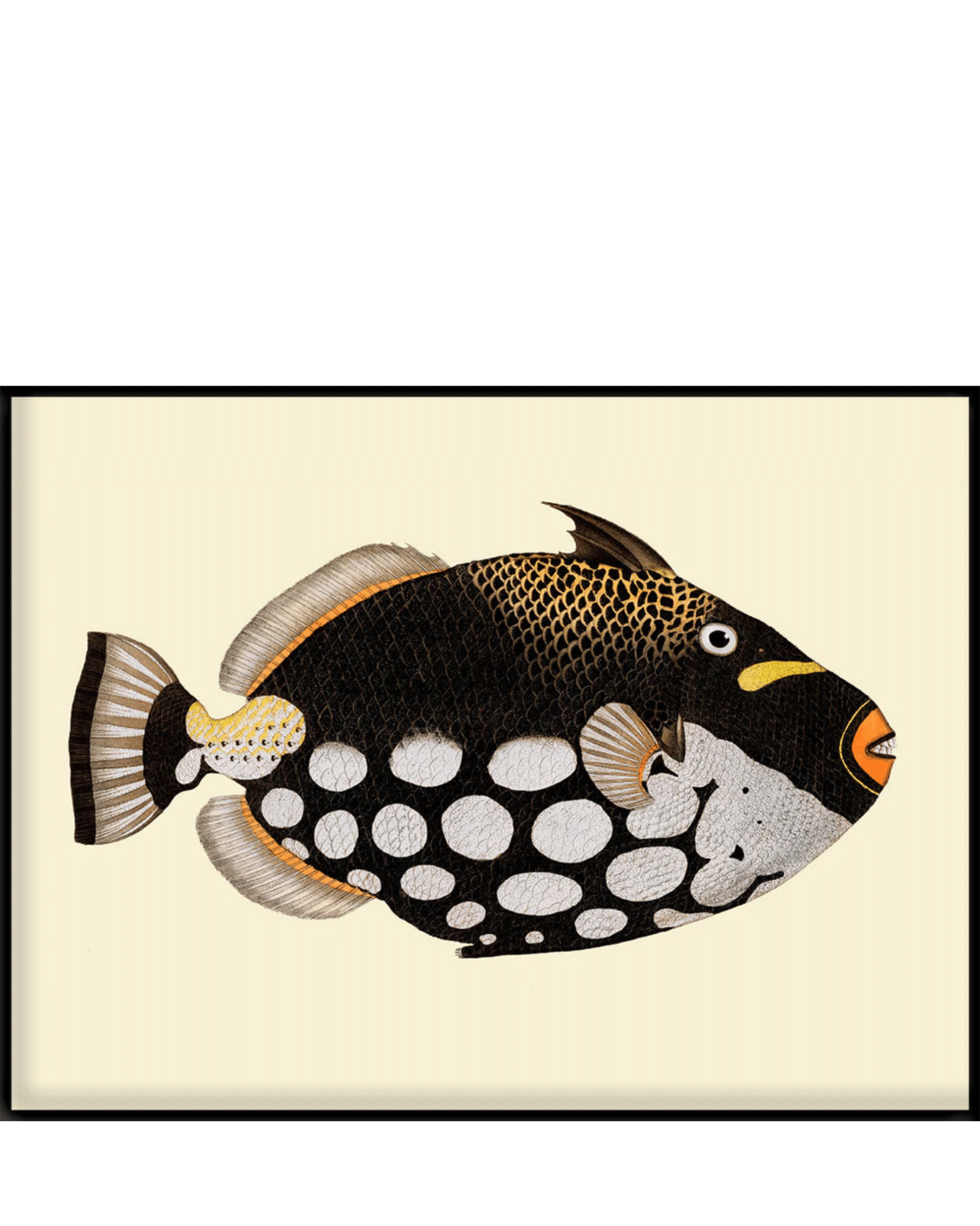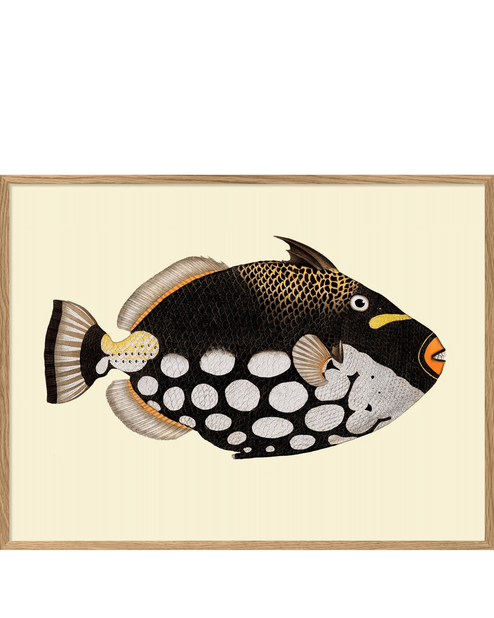 Färgstarkt konsttryck av den unga clown triggerfisken, med sitt prickiga mönster och leopardliknande detaljer. Tryckt med arkivbläck på Hahnemühle-papper i vår studio i Danmark.
