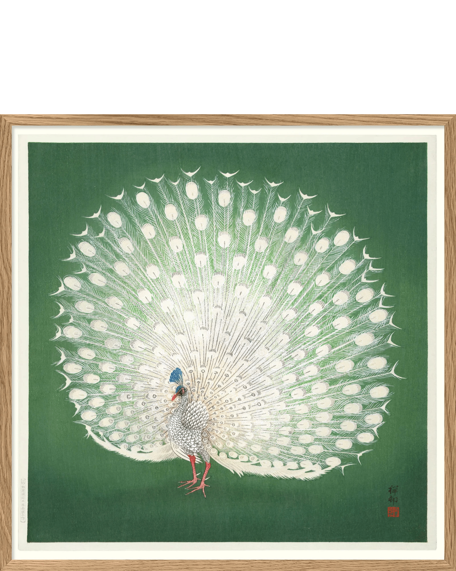 Fånga naturens prakt och elegans med detta utsökta konsttryck av en påfågel mot en djupgrön bakgrund. Påfågeln, känd för sin storslagna fjäderdräkt och majestätiska hållning, symboliserar skönhet, stolthet och förfining, egenskaper som genomsyrar hela detta konstverk.