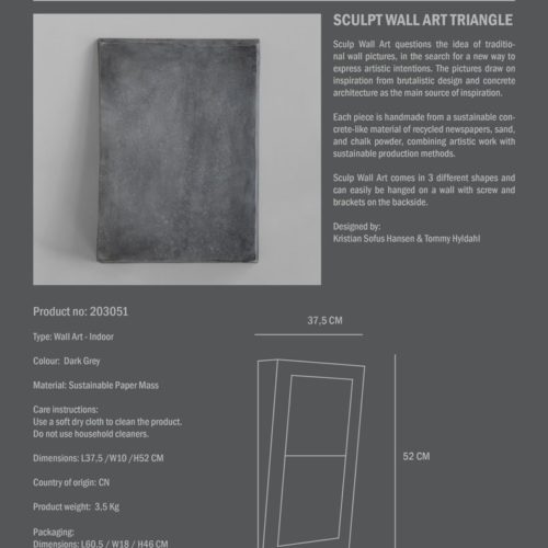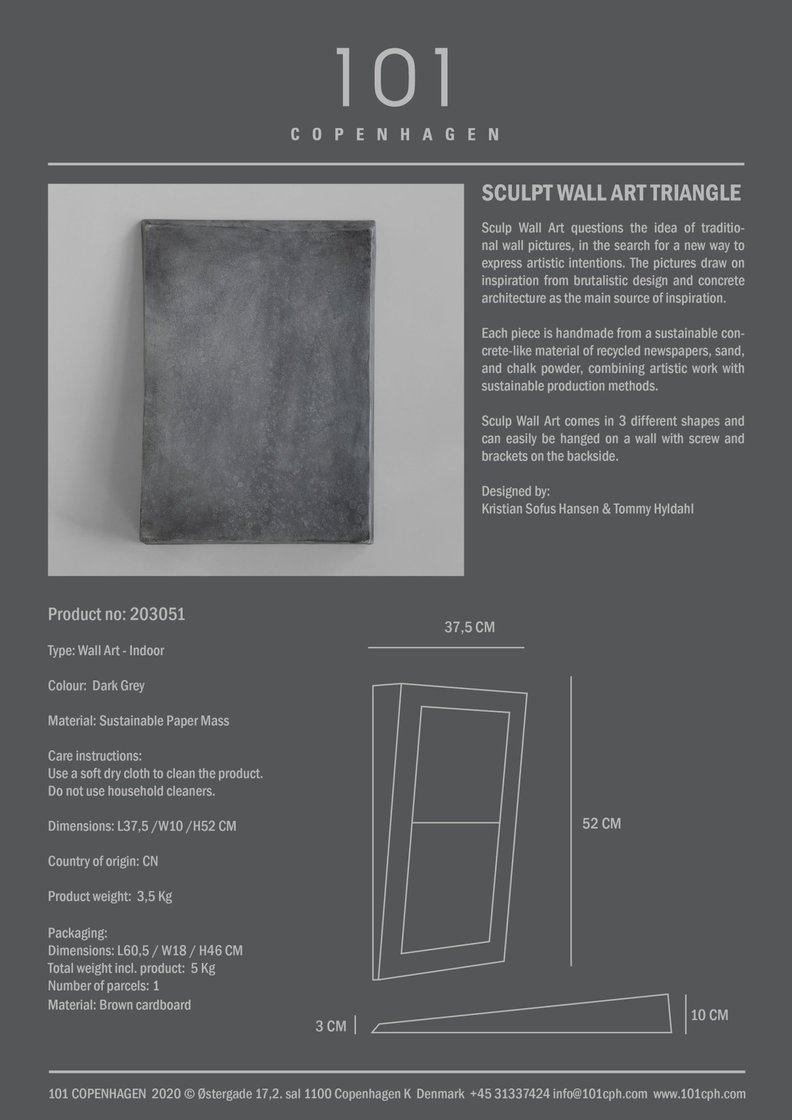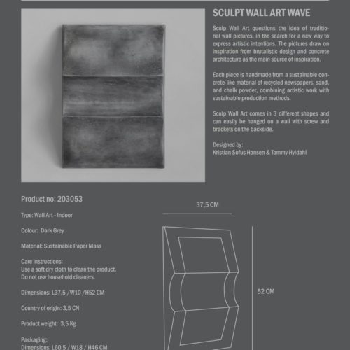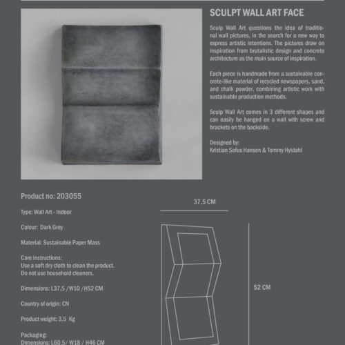 Sculpt Art -samlingen är en serie reliefer för att hänga på väggen som rena konstnärliga avsikter. De skulpturala bitarna hämtar sin inspiration från brutalistiska arkitekturdetaljer, designhistoria och betong som yta och material i amerikansk minimalistisk konst på 1960 -talet. Varje bit är handgjord av ett hållbart betongliknande material av återvunna tidningar, sand och krita pulver, som kombinerar konstnärligt arbete med hållbara produktionsmetoder. Sculpt Wall -serien finns i tre olika former och kan enkelt hängas på en vägg med skruvar och fästen på baksidan.