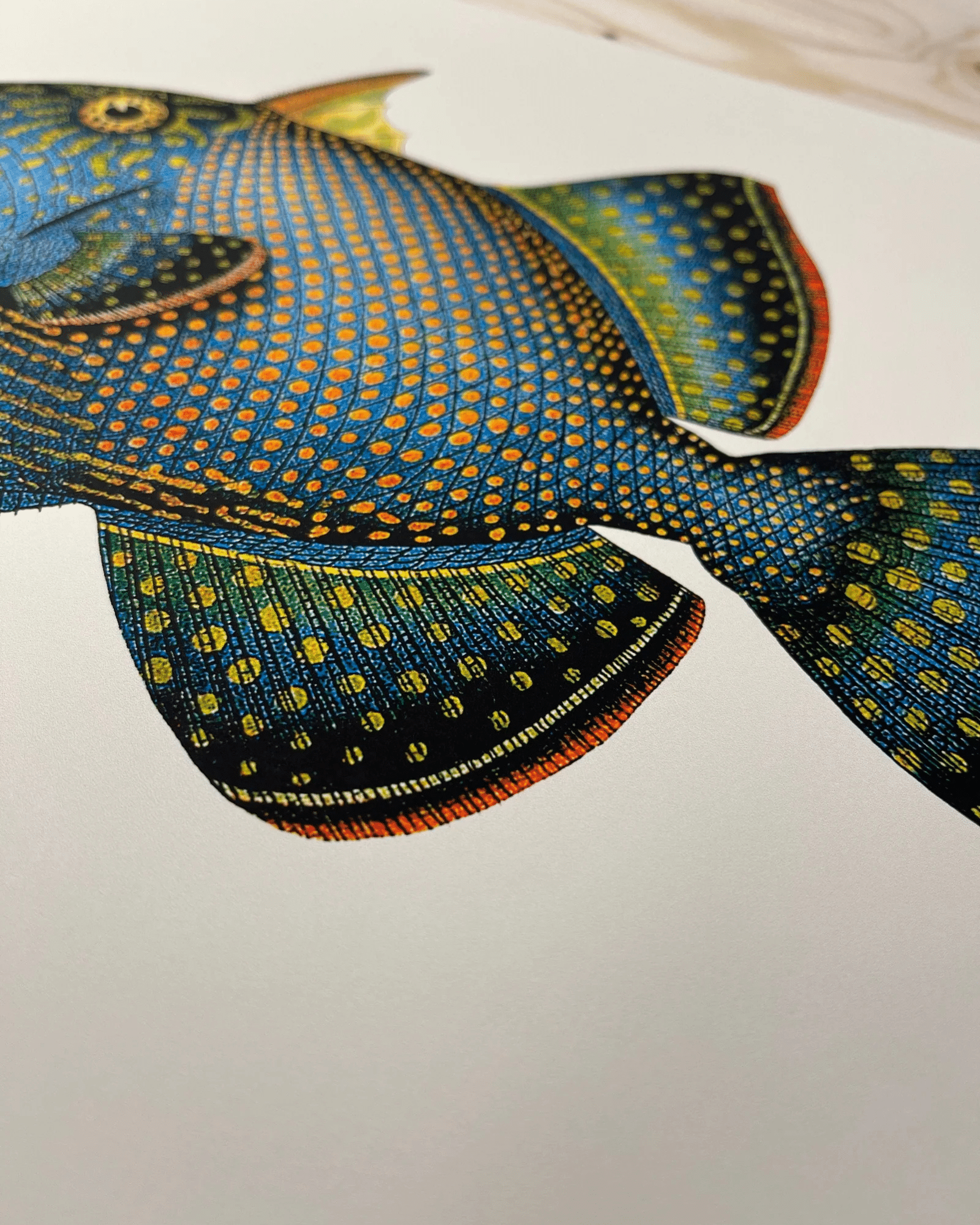 Detaljerad illustration av den unika triggerfisken, känd för sin kraftiga käke och karaktäristiska kroppsform. Tryckt med japanskt arkivbläck på exklusivt Hahnemühle-papper i vår studio utanför Köpenhamn. Ett elegant konsttryck för natur- och havsentusiaster.