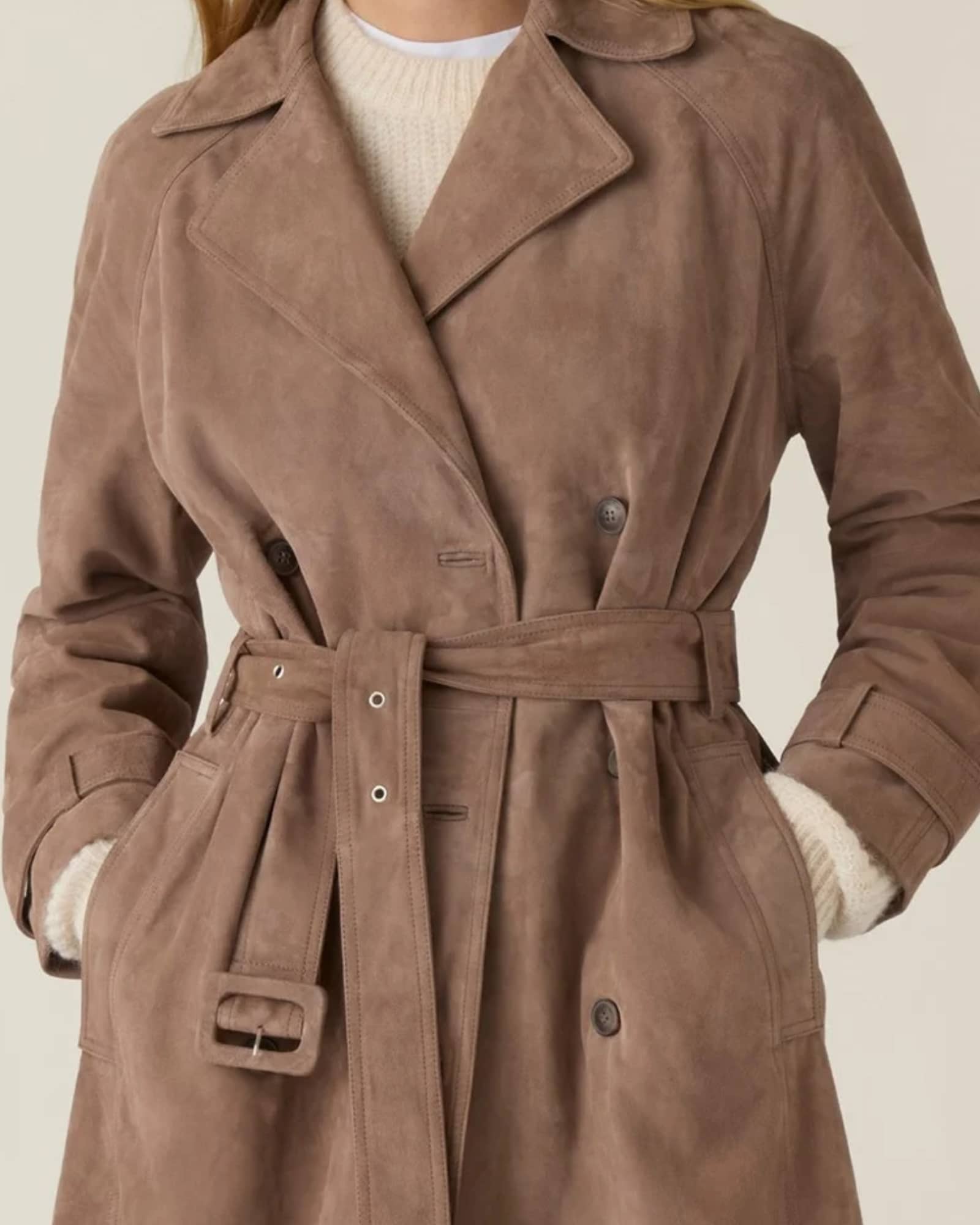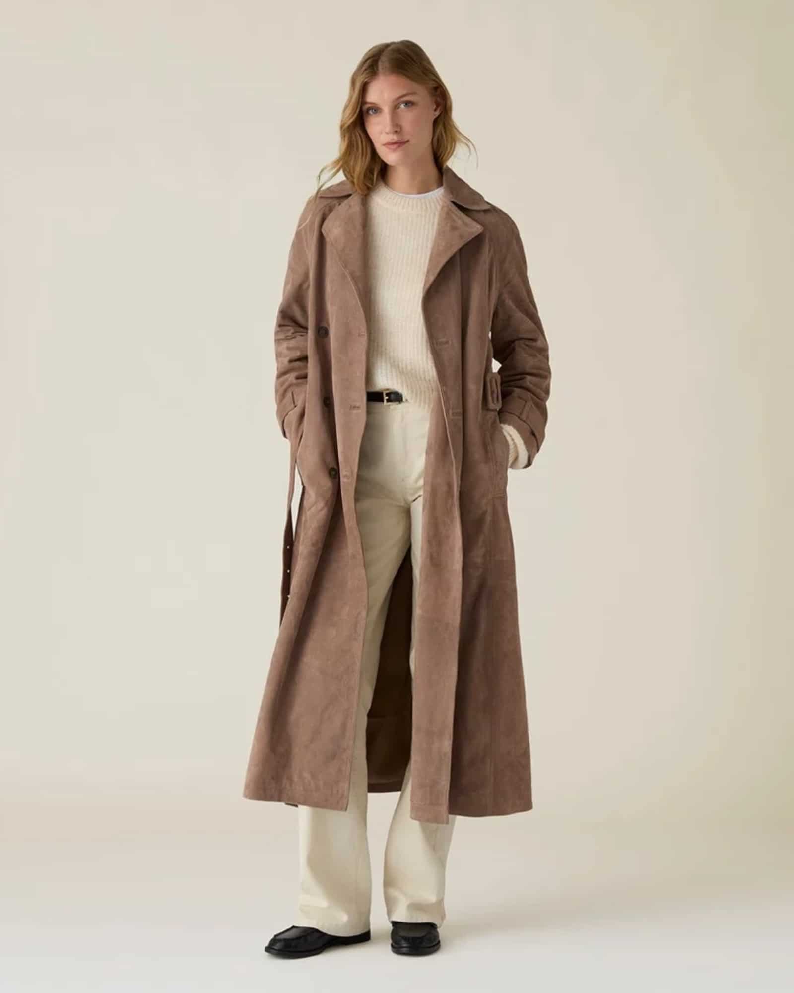 Lexington trenchcoat ljusbrun mocka. Lexington trenchcoat i ljusbrun mocka är ett exklusivt ytterplagg som kombinerar tidlös design med lyxiga material. Redan vid första intrycket ger den mellanbruna nyansen ett varmt och sofistikerat uttryck. Samtidigt tillför mockans mjuka struktur både karaktär och elegans, vilket gör kappan till ett naturligt blickfång i garderoben.