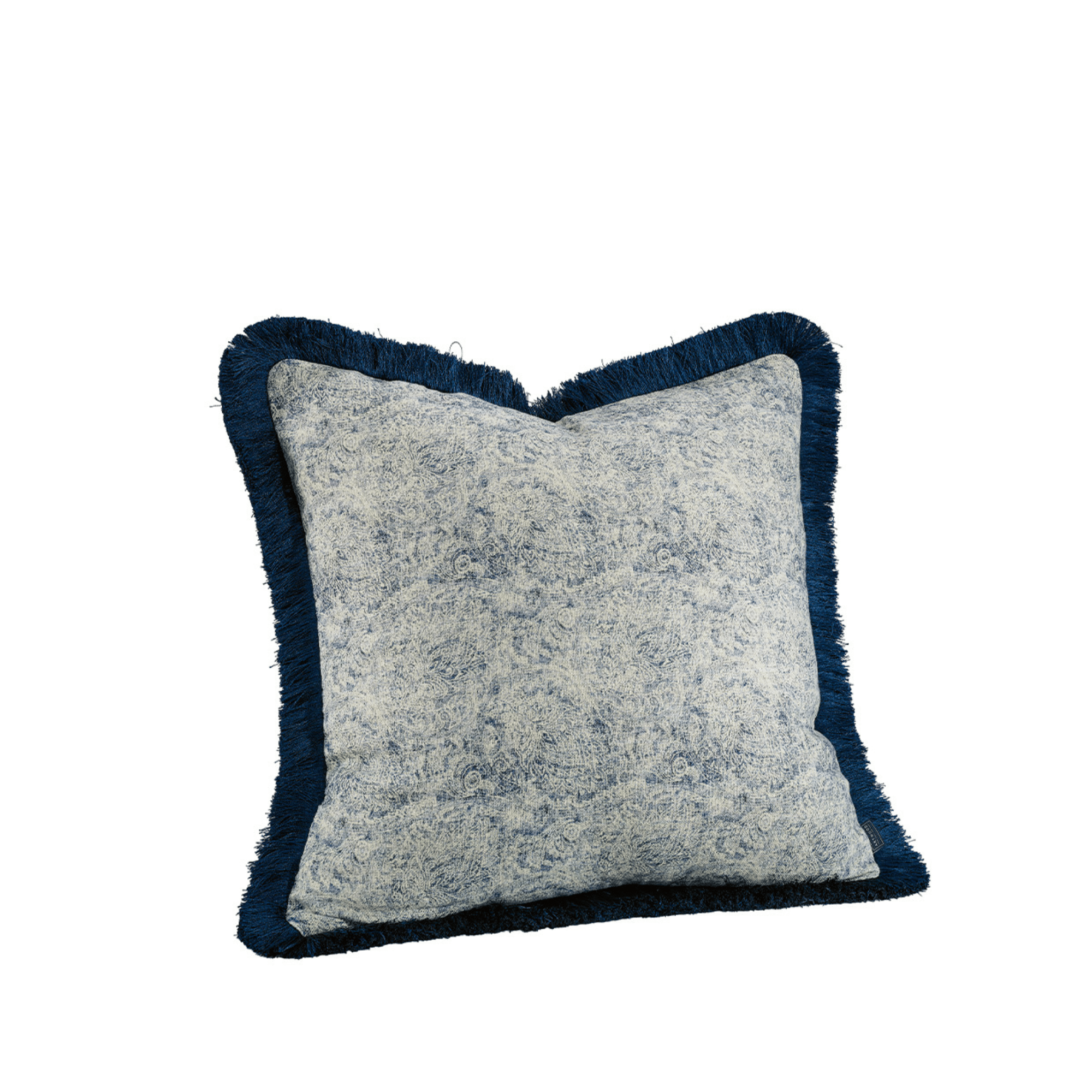 Den mörkblå fransen runt kanten tillför en dekorativ detalj som skapar en avslappnad men genomtänkt look och ger kudden extra karaktär utan att ta över helheten.